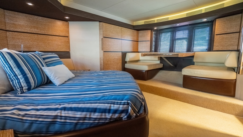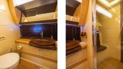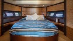 VIP with centerline queen berth is forward, guest with twin beds to starboard, guest head to port. Climate controlled crew quarters aft.