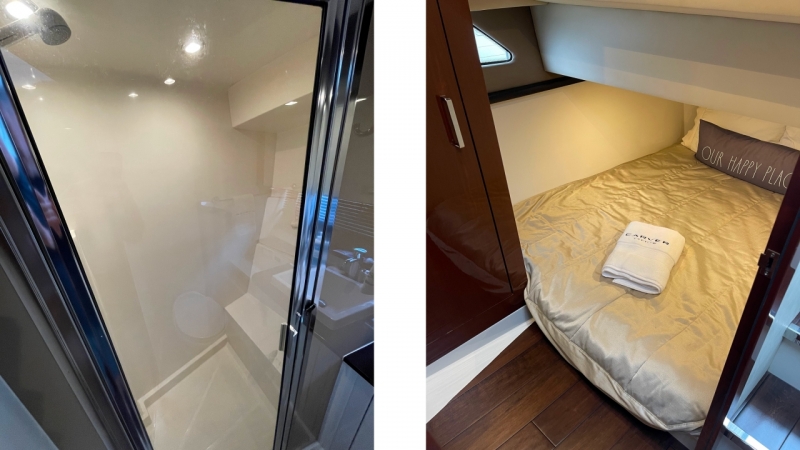 In recent years Carver has stepped up its design and build quality considerably. The aggressive European lines, design aesthetic and features (sliding sunroof and articulated cockpit shade) are decidedly up market from previous generations and the C37 is a particularly strong example of this trend. A two-stateroom yacht with 6’8” of headroom, she is a surprisingly large yacht that fits in a 40’ slip and has very modern interior design including a salon sunroof.