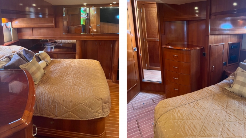 Master stateroom is midship below pilothouse and has athwartship island queen, ensuite head and plenty of rich high gloss cherry surfaces,