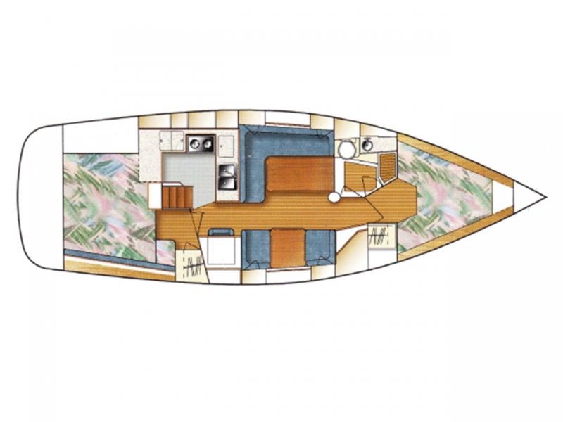 U-shaped galley aft to port, dinette forward to port.