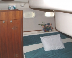 The 376 includes a roomy cockpit with hinged helm seat and walk-through transom to the swim platform. She has a bright interior thanks to her main cabin windshield, two private staterooms and a well equipped galley. Open and spacious with ample storage. Ours is a wonderful cruising yacht, a great combination of sailing performance and livability. We have kept her very well maintained.