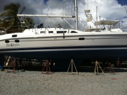 The center-cockpit 450 Passage is ideal for extended cruising, island hopping or even live-aboard. Her two double staterooms w/heads afford great comfort and privacy for two couples yet her hull and sail plan provide excellent performance. Ours has spent 5 years enjoying the Caribbean from Puerto Rico to Grenada but has spent the last 3 years at Palmas del Mar in Puerto Rico. We have added extensive LED lighting that can be used with the inverter so that it is available without running the generator.  The bimini covers the entire cockpit area and has eisenglass curtains that roll up and down with zippers and snaps.