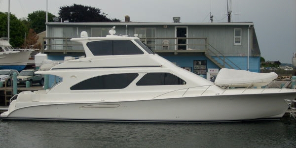 Ocean 65 Odyssey has an enclosed fly bridge, a cruse friendly cockpit, and a transom storage garage large enough for the 10 foot RIB stored inside.