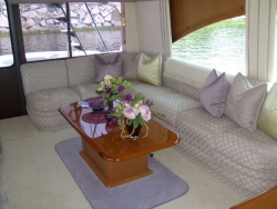 Electric grill, climate controlled fly bridge, Hi/Lo teak table in salon and on the bridge, Pompanette helm chairs.