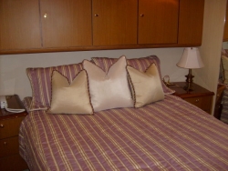 VIP stateroom is forward with athwartships island queen bed and ensuite head. Guest stateroom has twin beds and office area. A single-bed stateroom/crew quarters has access to shared head.