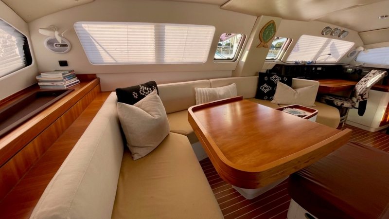 This Barreau design stays true to the original Outremer mission of performance, safety and simplicity. Where it improved on the older designs is in livability. The large cockpit flows on one level, through a sliding door, into the salon/nav/galley area where ample vertical windows provide all-around views and exceptional light. Oceanaire blinds/screens on accommodation space overhead hatches.