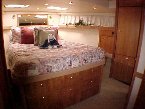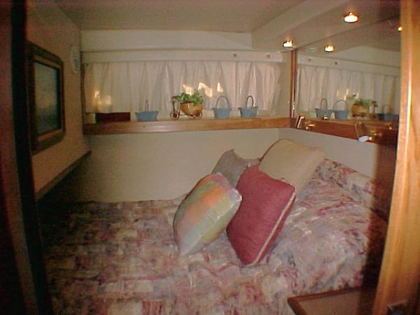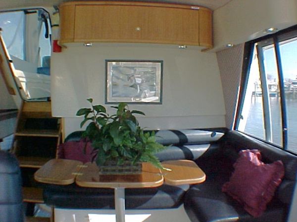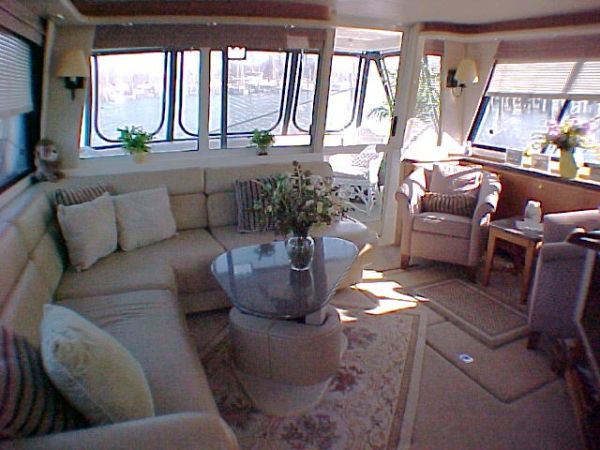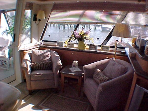 The salon offer luxurious surroundings with plenty of room for entertaining, featuring to starboard an L-Shaped settee with ample storage beneath, two chairs port side, entertainment bar with built-in blender, stainless steel sink, custom built wine rack, mini blinds by Boat Blinds, carpet and dinette Hi-Lo table that converts to Ottoman, Cocktail or Coffee Table hydraulically operated.