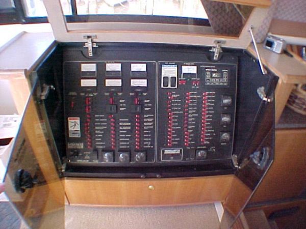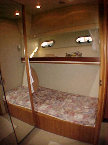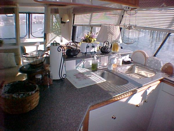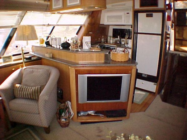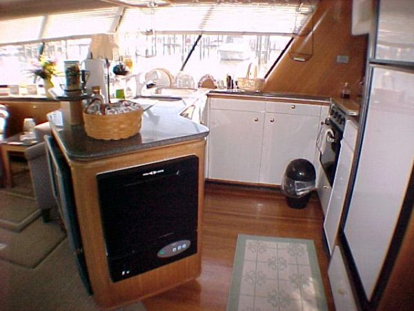 On the same level as the saloon making meal preparation a part of the action as opposed to being separated in a lower galley station. The beautiful galley is equipped with Avonite counter tops, ample storage cabinets, coffee maker, Norcold refrigerator w/freezer compartment, trash compactor, Whirlpool microwave, Princess three burner propane stove w/oven and solenoid switch, double stainless steel sink, ice maker, storage pantry, dishwasher, and plenty of light and ventilation.
