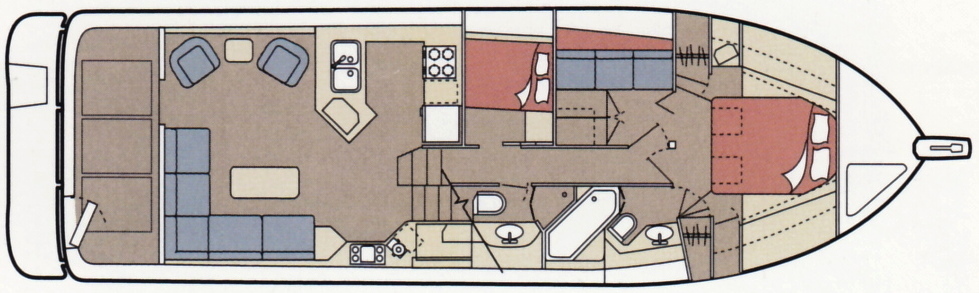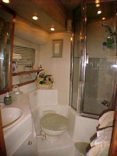 The midship stateroom offers another a double berth and across the companionway is a second bath complete with shower.
