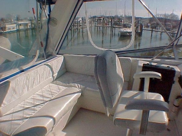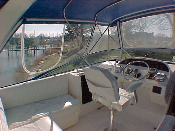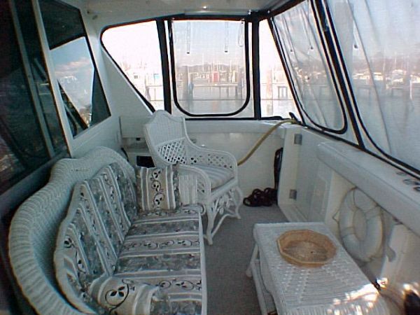 A large "room" as it is fully enclosed for comfort in all weather, the aft deck features a wet bar, transom shower, transom door, swim platform, self bailing cockpit, and carpet. A perfect extension of the main saloon for entertaining, or a private sun room for your quiet times on the water.