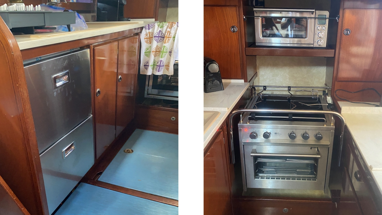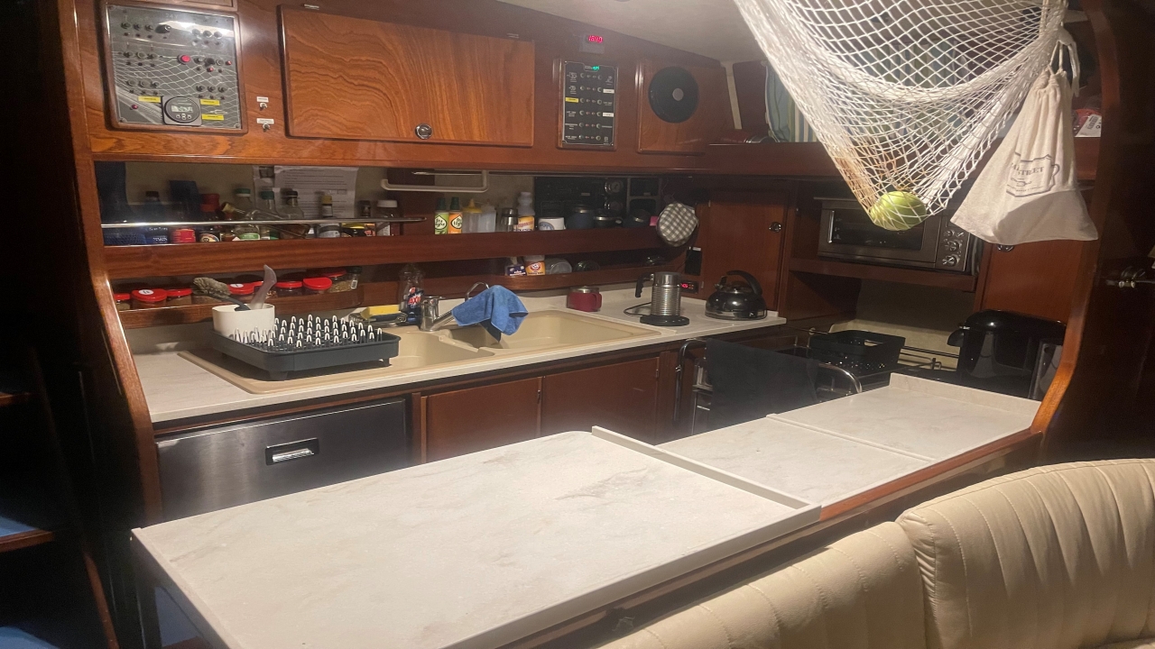 Extensively updated and improved galley. Custom Corian tops that fit over the existing galley tops. Makes food prep a lot easier and can be removed at passage if needed. The old dishwasher “hole” was been re-purposed into a top load storage unit, all in matching Corian.