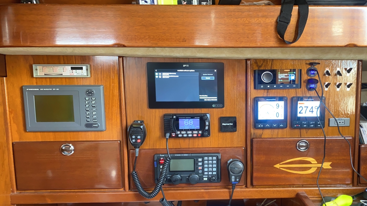 Updated - predominantly Raymarine, NMEA 2k backbone. Maps and Raymarine software updated (2024). Both MFDs run Navionics cards. Autohelm re-calibrated. Digital Yacht AIT5000 Class B+ Transponder. Raymarine LM2 Autopilot RAM (two new units, one as spare).