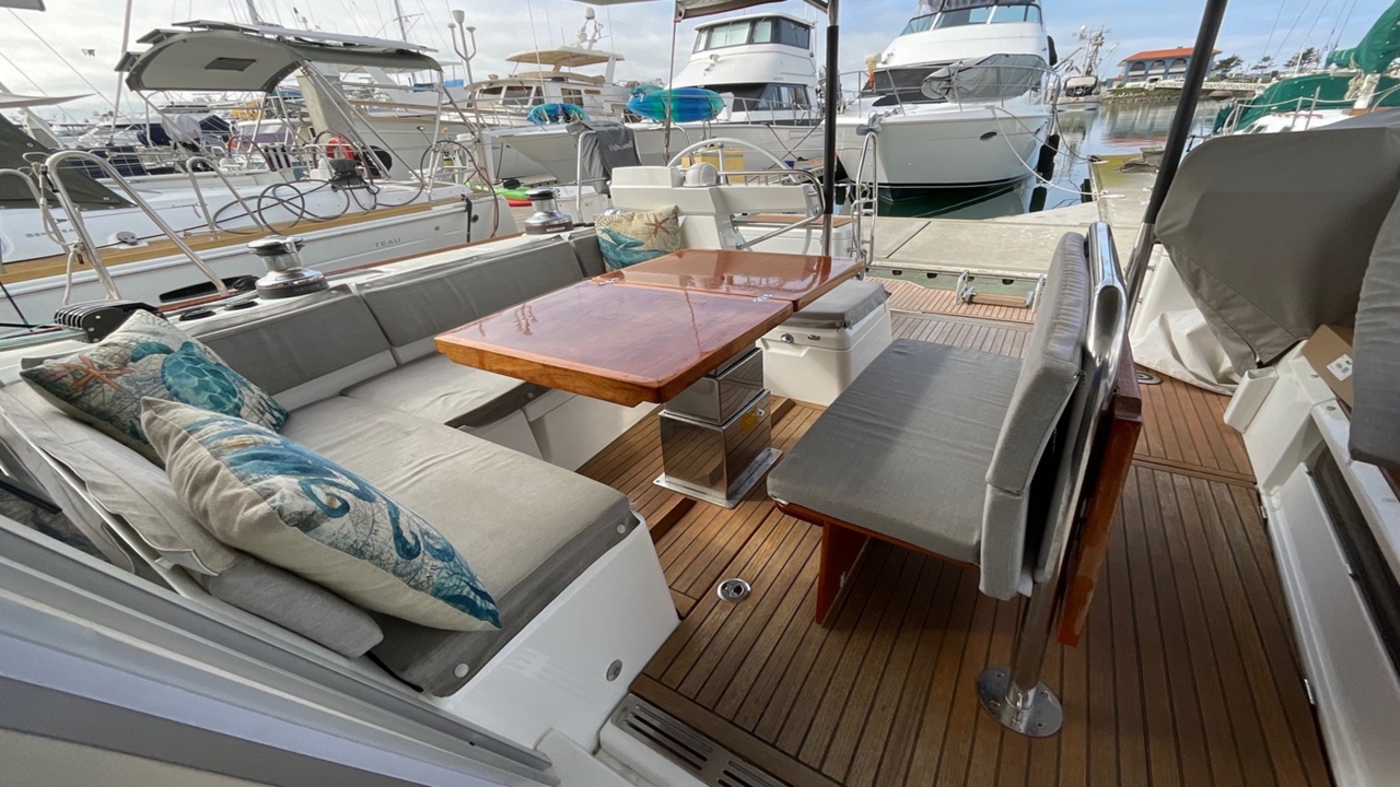 Extra wide cockpit with space normally found only in catamarans. Full cushions and enclosure with plastic mesh and removable eisenglass windows for weather protection. Main table electrical lowers and folds out to feed 8 with another table on the port side that can feed at least two more. Easy access from transom with hydraulic fold down transom. Dual fully instrumented steering stations for excellent visibility and boat handling.