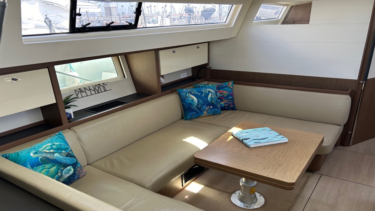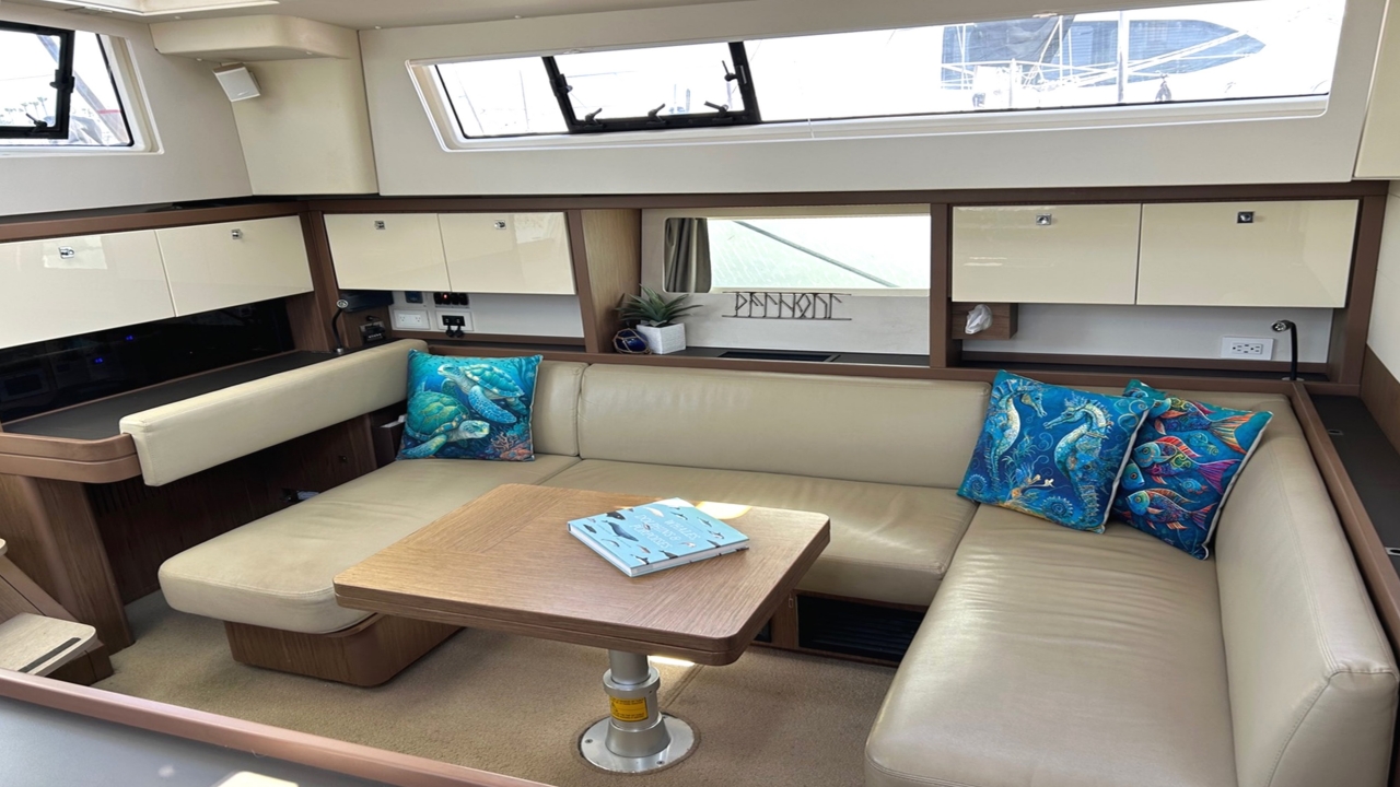 Comfortable seating for 8 in salon including a fold down ((hideaway seat) in the center island. Island houses pop up television for viewing from Salon. Table has electric lift and can lower to a cocktail table or raise up for dining. Extra cushion provided to make the salon area into a bed/playpen.