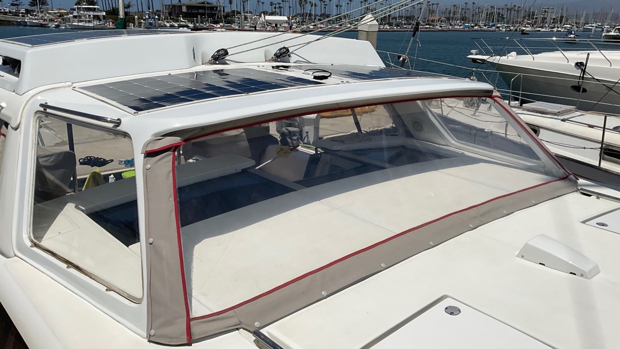 Retractable Bimini that covers the entire cockpit that slides open for full sun. Custom solid dodger. Replaced 2 small propane bottles with 30 lb tank. Both heads are electric fresh water flush. Custom Awlgrip HDT paint job on hull (2021)
