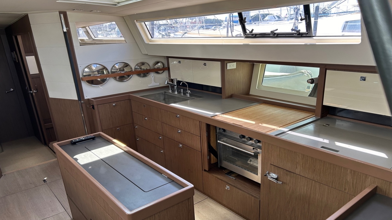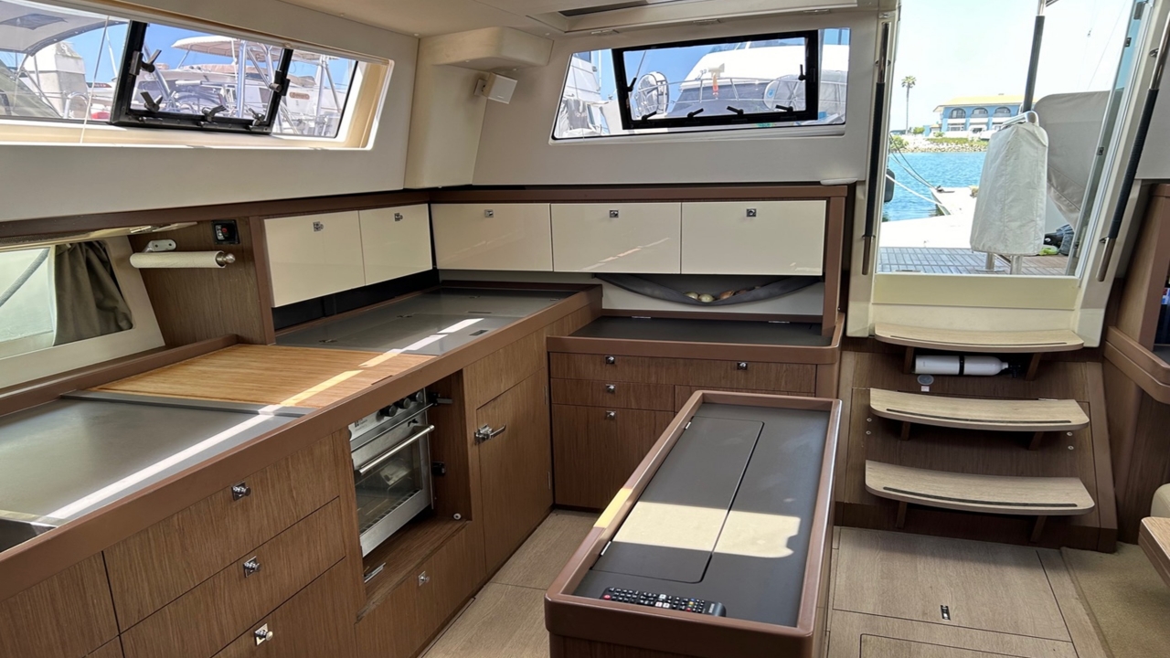 Galley and center island span the complete length of the salon space. Custom SS sink, filtered water spigot and faucet with pull out handle. Electric salt water hand sprayer for pre-washing and conserving fresh water. GN Espace propane oven and four burner cooktop. All storage has been converted to pull out drawers to maximize accessibility of all galley equipment.