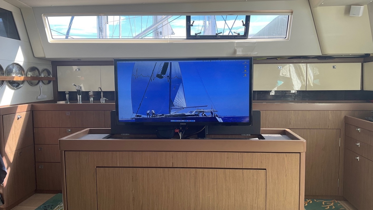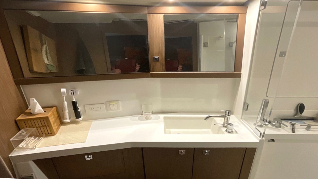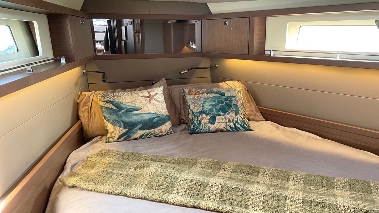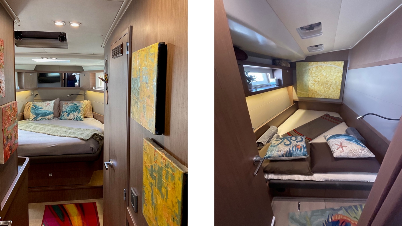 Queen size master with custom latex mattress. Storage in hanging locker, multiple shelved lockers and drawers under bed. Television mounted on forward bulkhead.