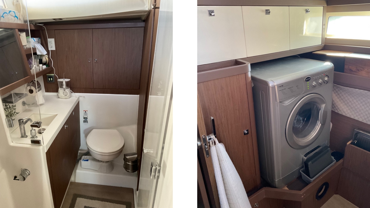 Custom stainless sink with fitted cutting board and drying rack, deeper drain/collection unit. New faucet with pull out spray handle. Salt water sprayer (electrical). Soap dispenser at sink. RO water dispenser at sink. Replaced oven with GN Espace propane oven ($5500). Added 120 volt outlet in easily accessible but safe location. Integrated with GFCI system.