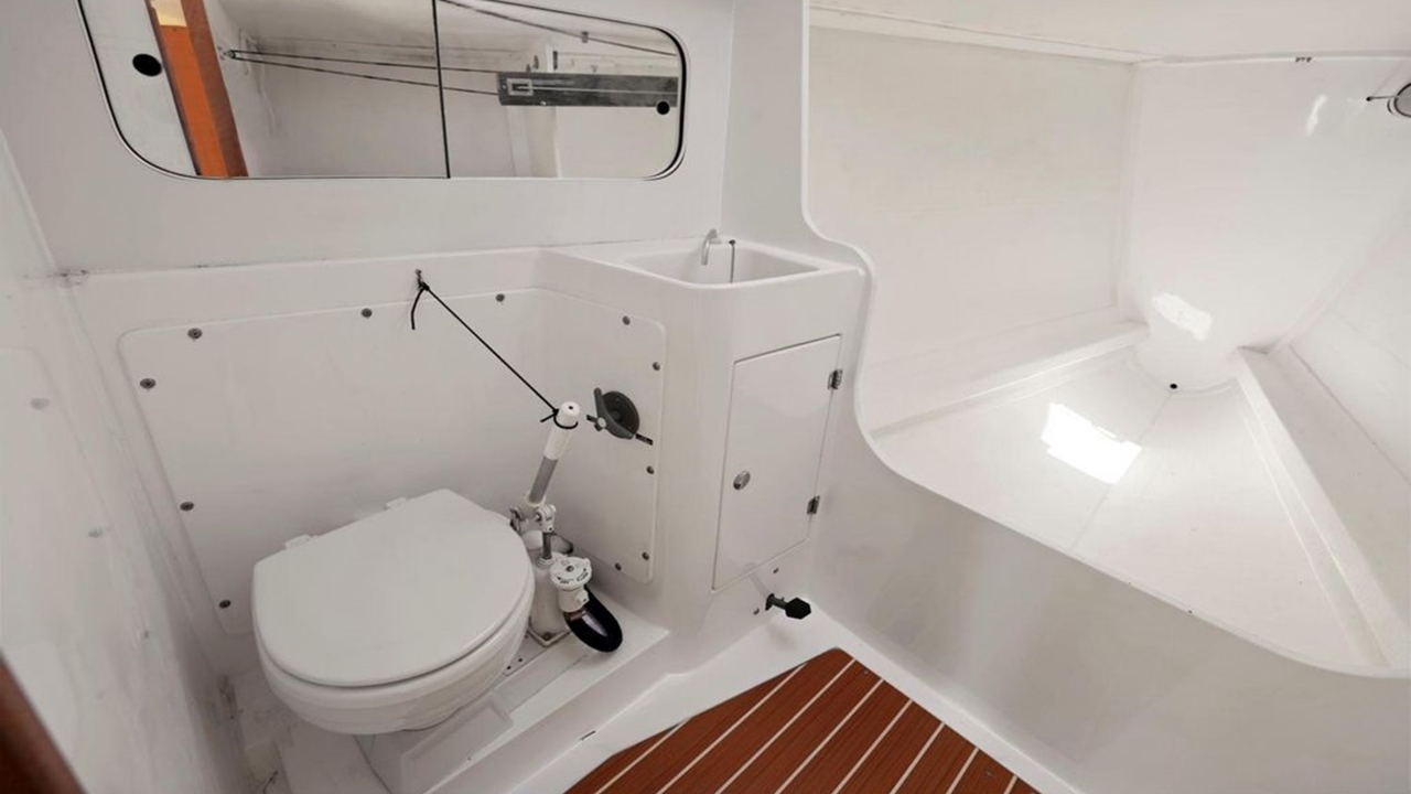 Marine head with deck pump out, flush through manual pump and holding tank.