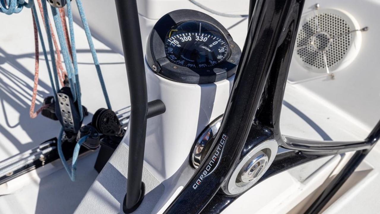 Composite wheel; black powder-coated stanchions and rails with custom carbon fiber roller tubes on Dyneema lifelines ($15,000 upgrade 2021); two tone deck; main cabin table.