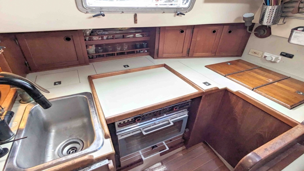 Origo 6000 Stove with oven (burns Denatured Alcohol which can be found in any hardware store). 12v fridge with small freezer. Hot / cold water 6 gallon water heater (110v or engine heated). Salt water pump.
