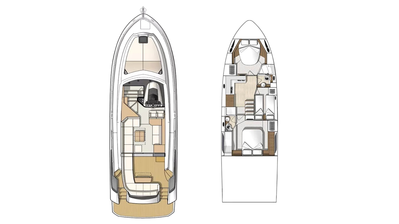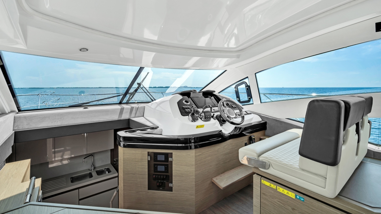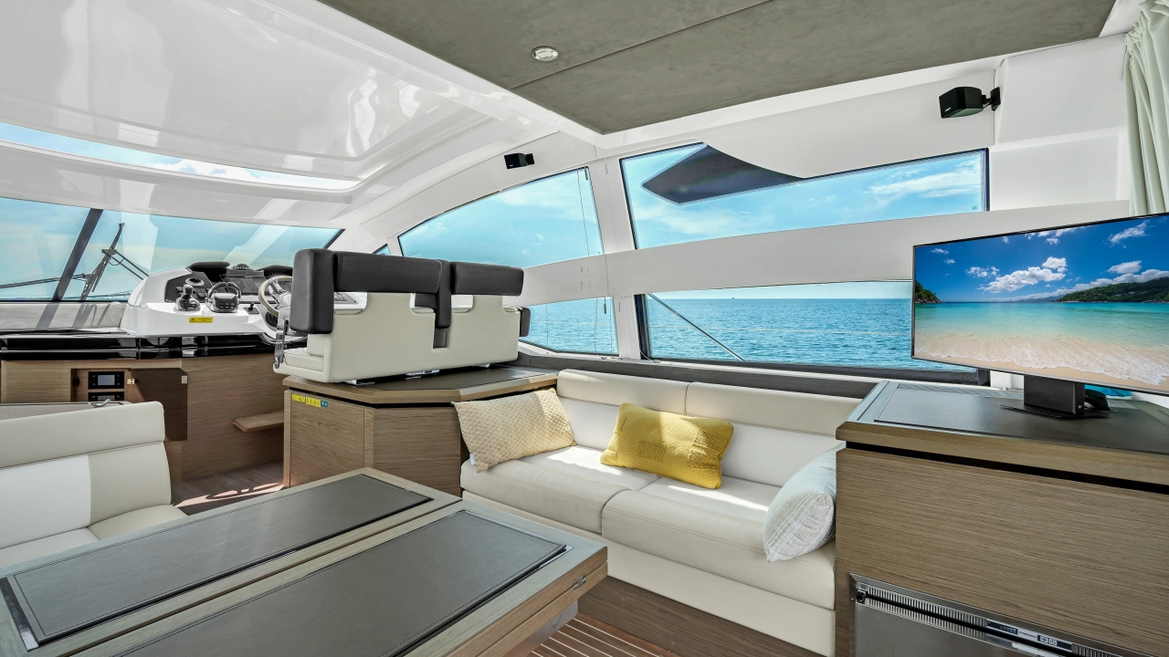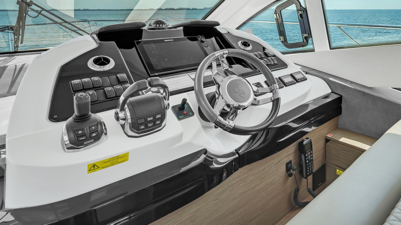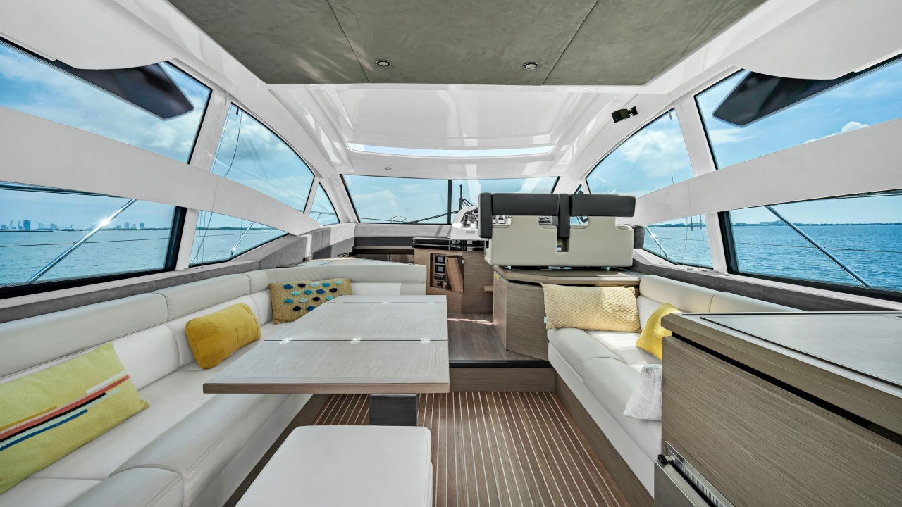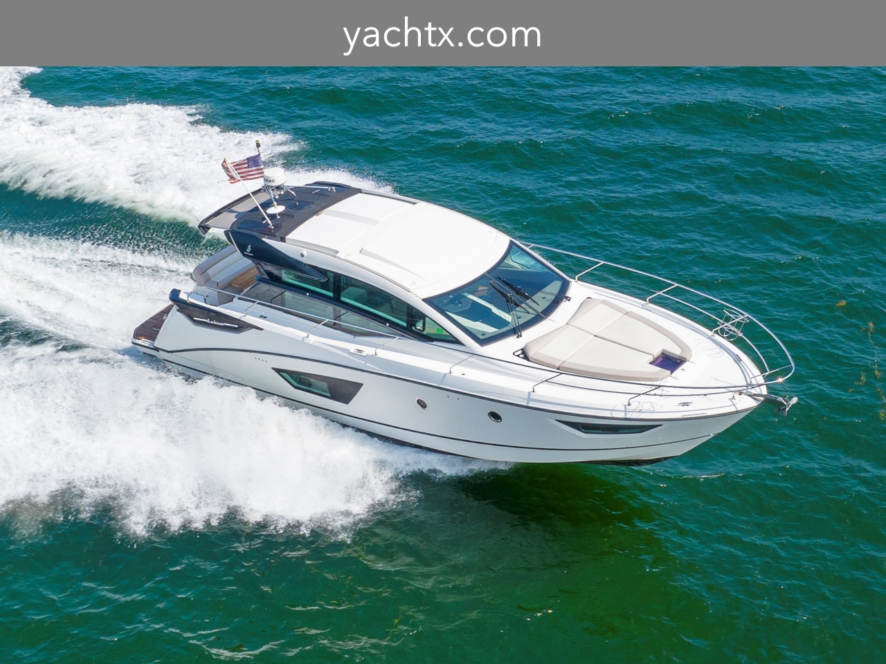 Beneteau’s Gran Turismo 50 coupe combines cruising luxury and innovative technology in a yacht with a graceful profile, wide open layout and enormous settee adjoining the cockpit and the salon. The full beam master suite is amidship, and the forward VIP cabin features twin beds that join to form a center line double, 3rd stateroom has twin beds. Salon power windows and a large retractable sunroof provide plenty of natural light. She has the preferred 3 stateroom/2 head layout with galley down, optional hydraulic swim platform and the tender garage with 9-foot Williams Jet tender.