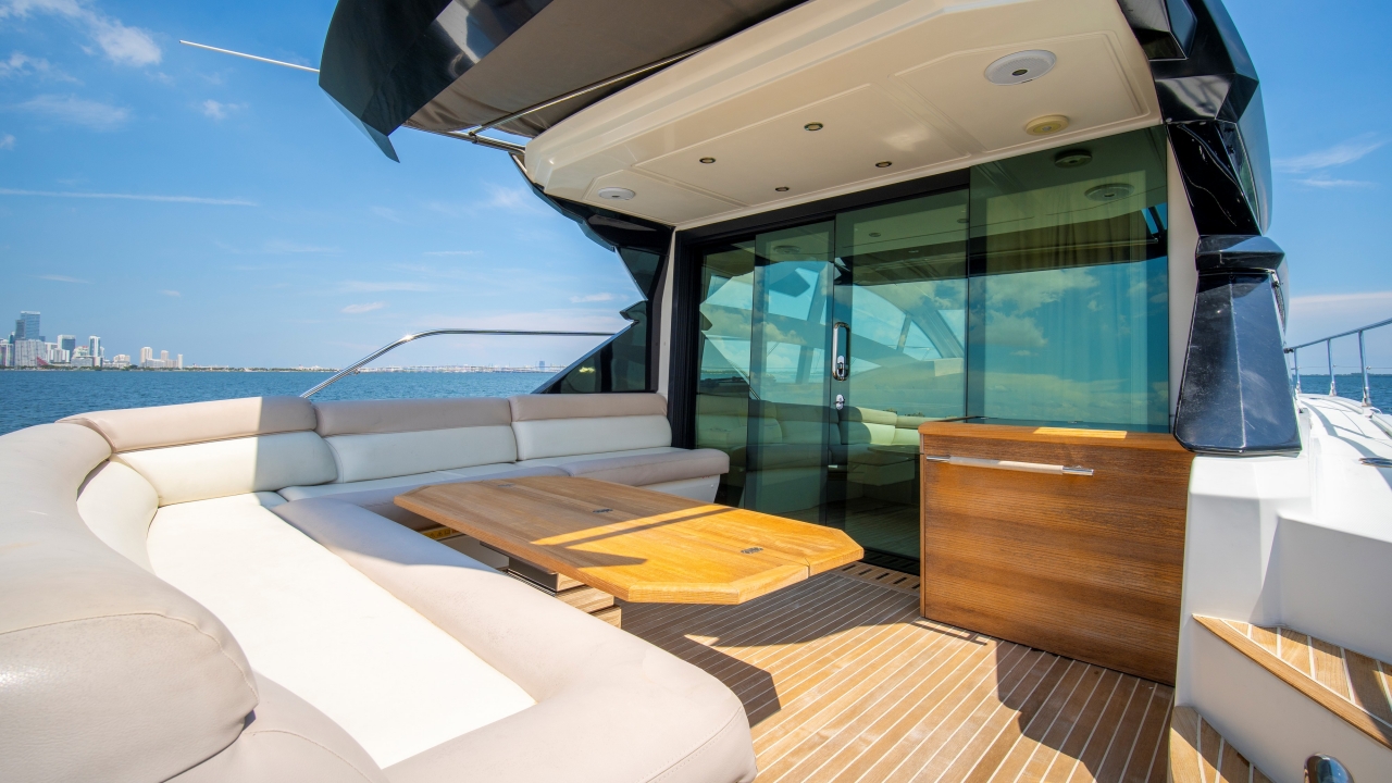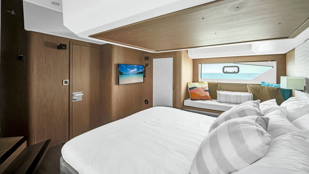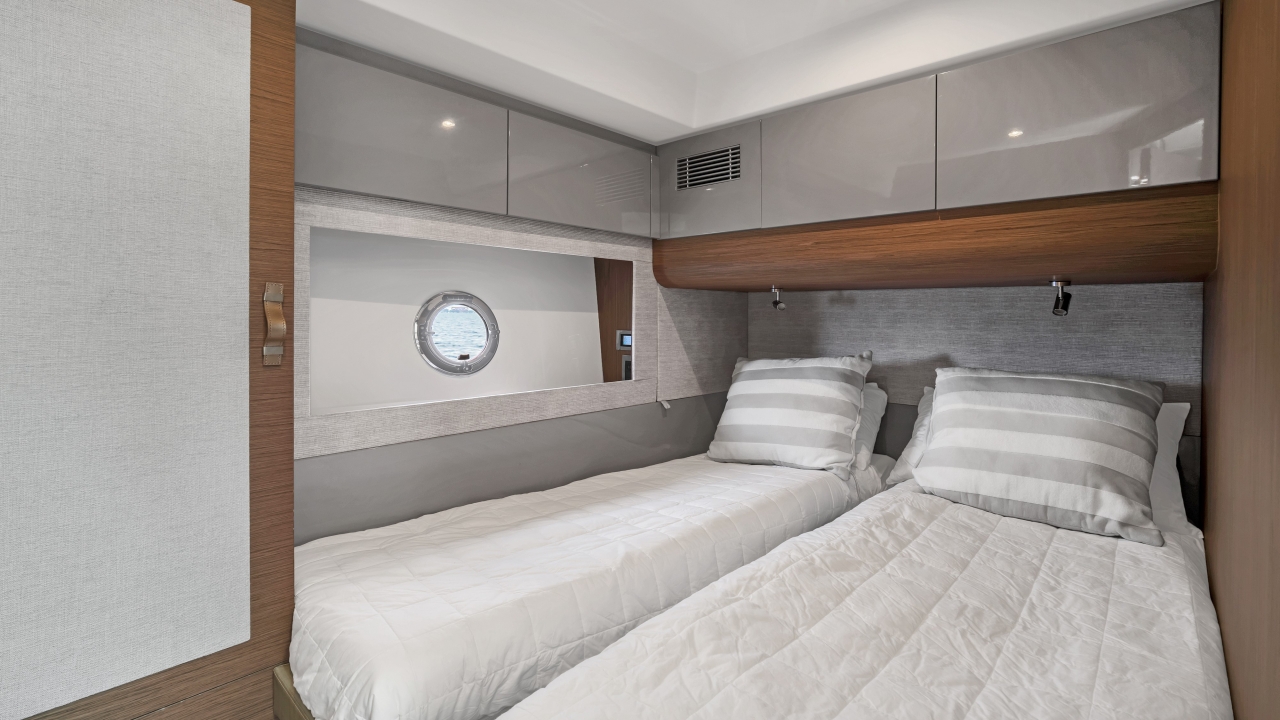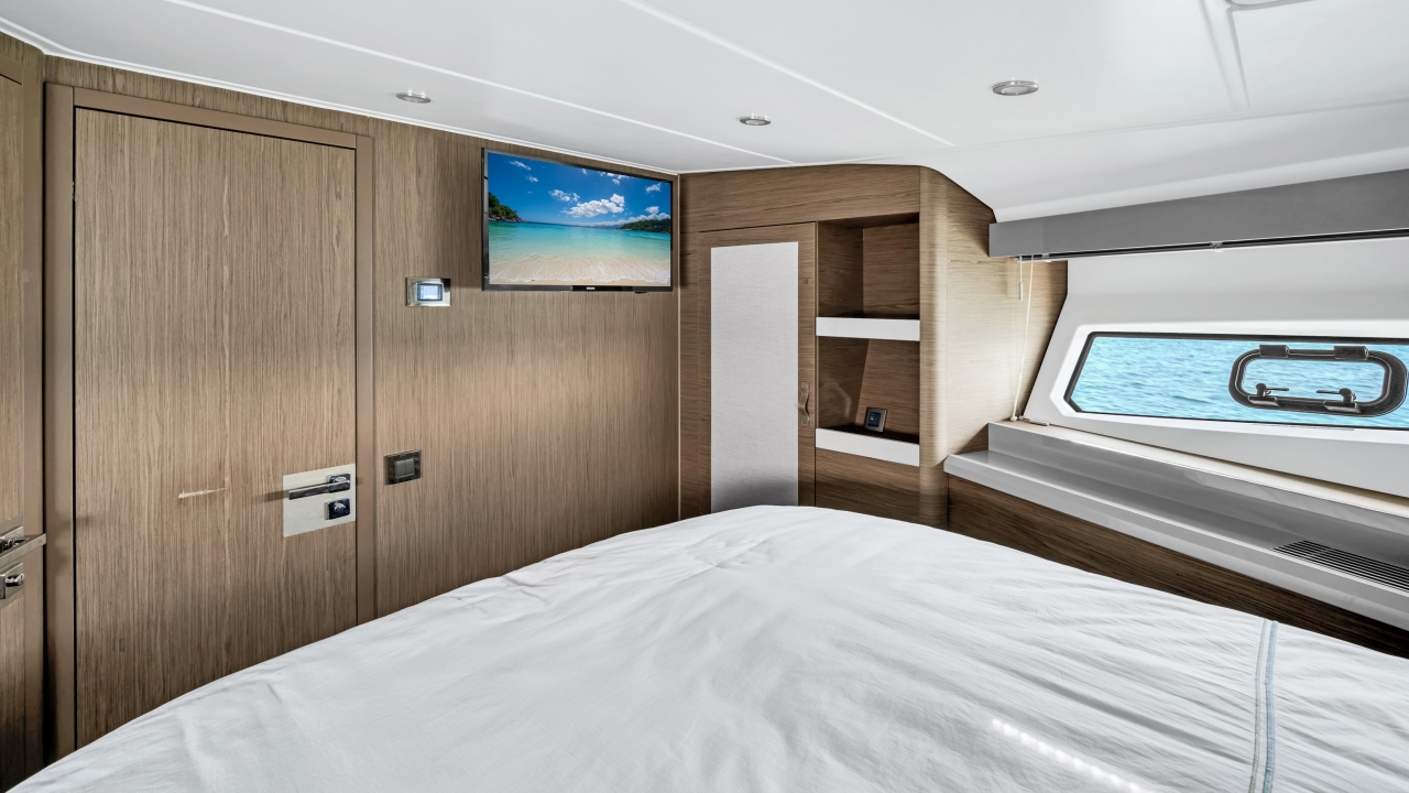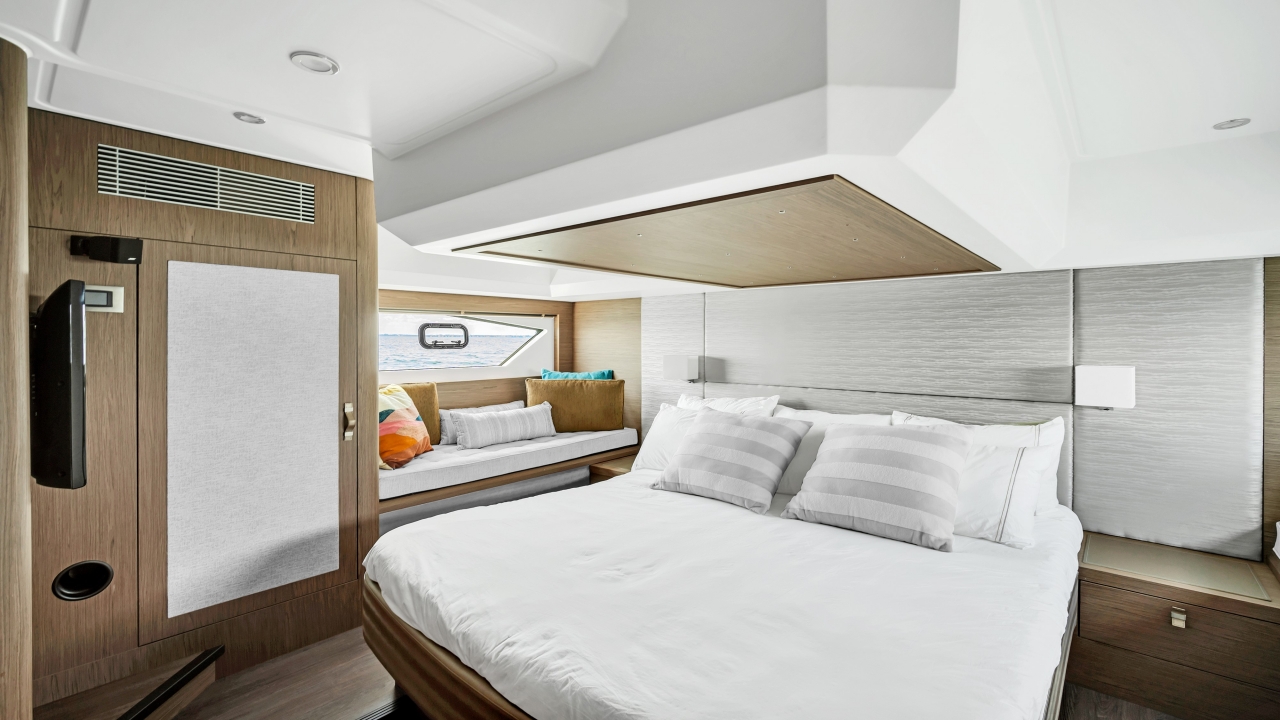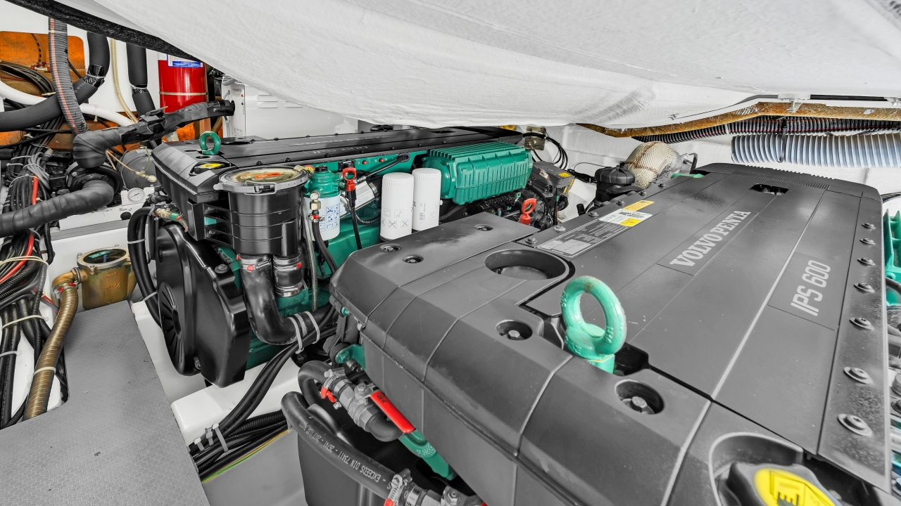 Beneteau’s Gran Turismo 50 coupe combines cruising luxury and innovative technology in a yacht with a graceful profile, wide open layout and enormous settee adjoining the cockpit and the salon. The full beam master suite is amidship, and the forward VIP cabin features twin beds that join to form a center line double, 3rd stateroom has twin beds. Salon power windows and a large retractable sunroof provide plenty of natural light. She has the preferred 3 stateroom/2 head layout with galley down, optional hydraulic swim platform and the tender garage with 9-foot Williams Jet tender.
