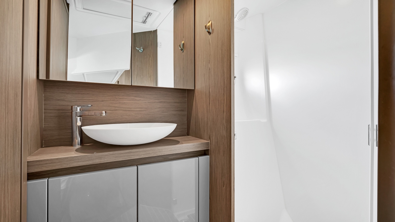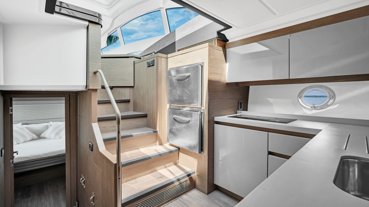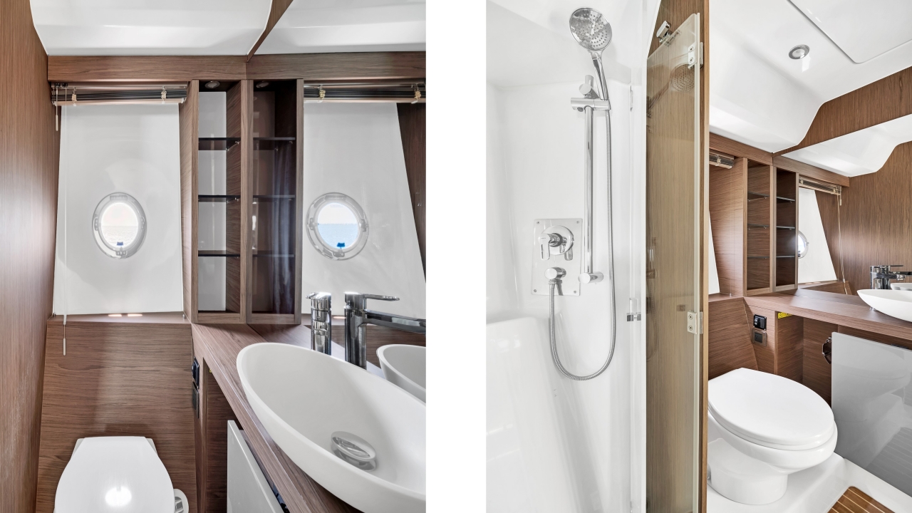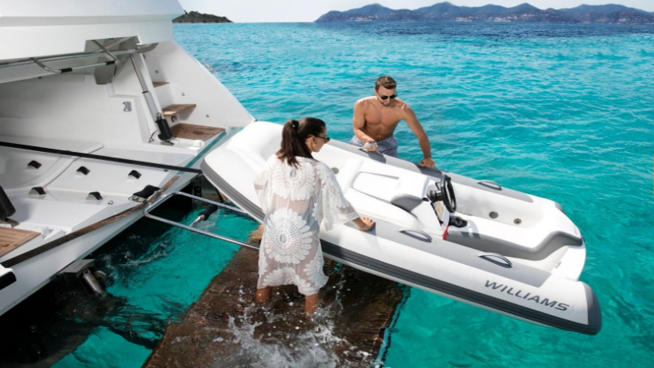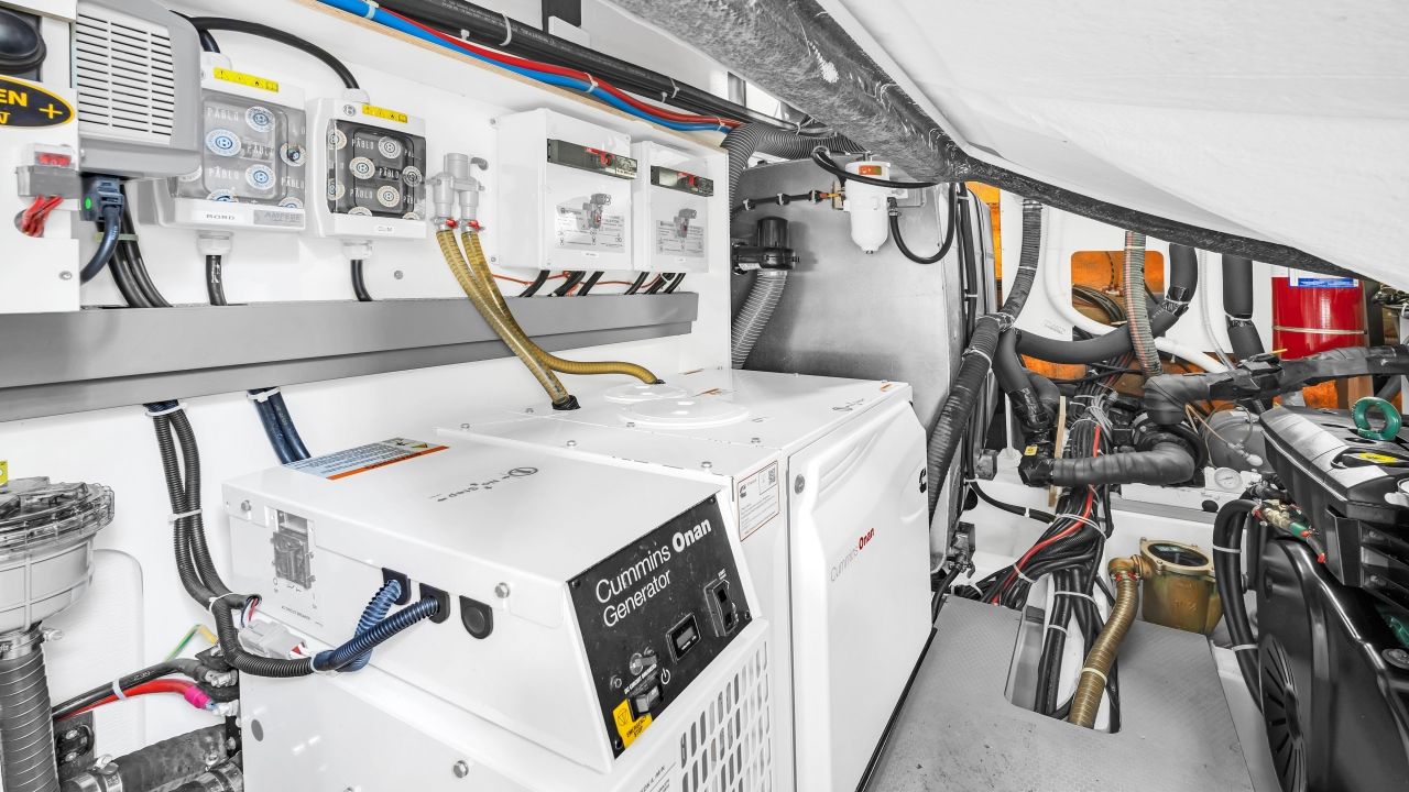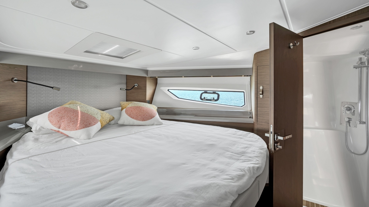 Beneteau’s Gran Turismo 50 coupe combines cruising luxury and innovative technology in a yacht with a graceful profile, wide open layout and enormous settee adjoining the cockpit and the salon. The full beam master suite is amidship, and the forward VIP cabin features twin beds that join to form a center line double, 3rd stateroom has twin beds. Salon power windows and a large retractable sunroof provide plenty of natural light. She has the preferred 3 stateroom/2 head layout with galley down, optional hydraulic swim platform and the tender garage with 9-foot Williams Jet tender.
