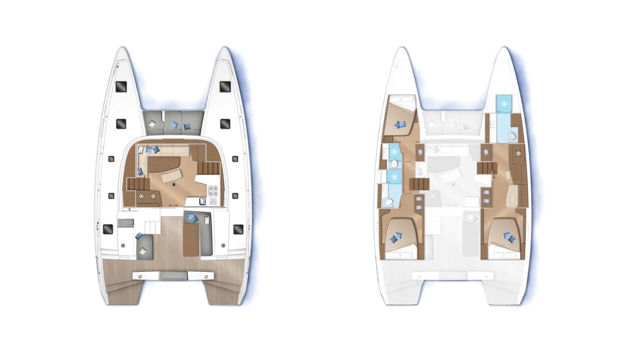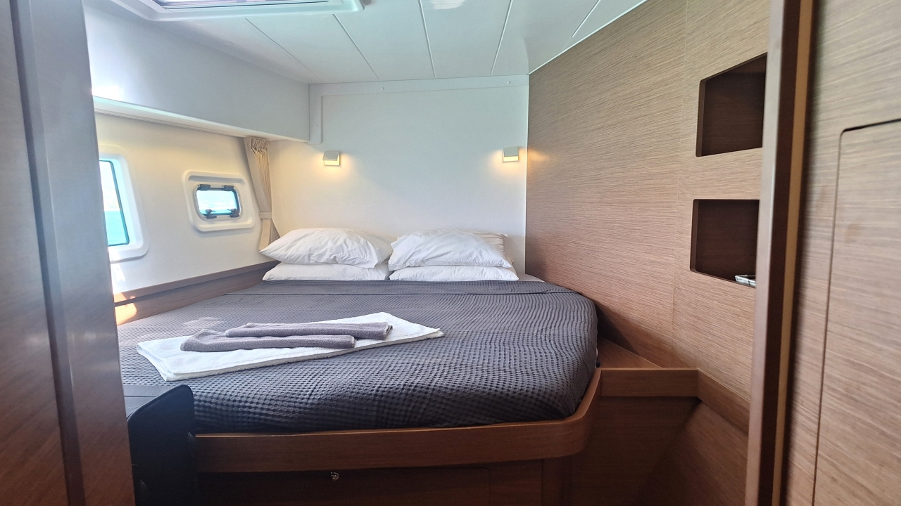 Two guest staterooms in port hull with double berths and separate ensuite heads.