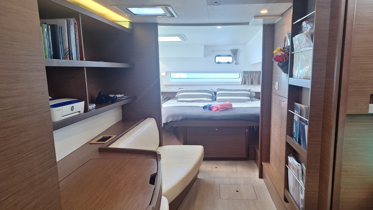Large master stateroom in starboard hull includes office area and ensuite head.
