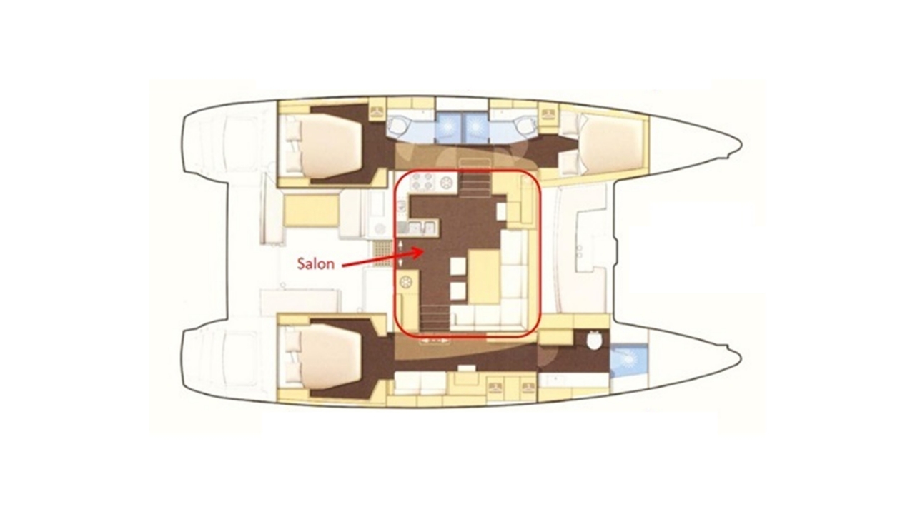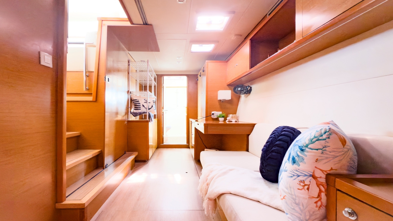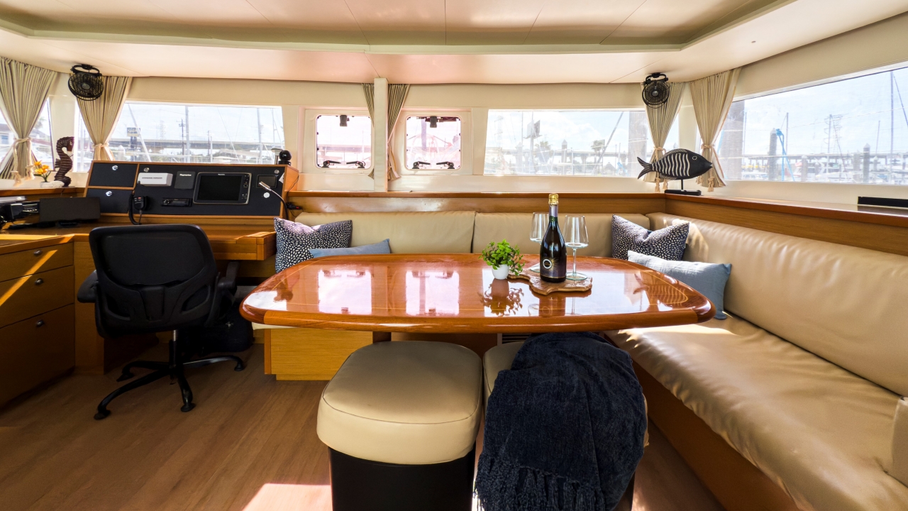 The 450 flybridge version gives optimal visibility and access to sailing controls while providing easy access to the main cockpit and seating areas via twin stair wells. Lounging areas abound for the family and crew to relax under way or in port. Large salon windows provide superb visibility while maximizing interior space and keeping the interior cool under roof overhang.