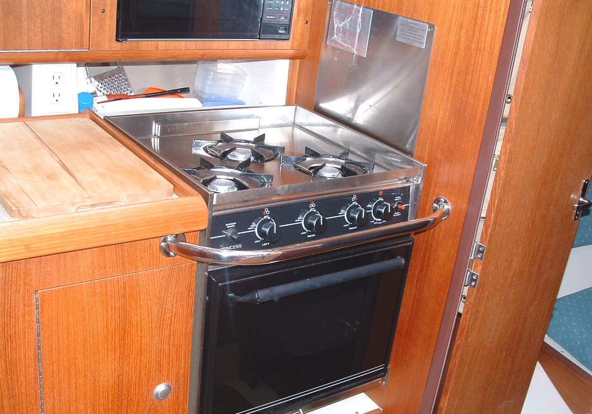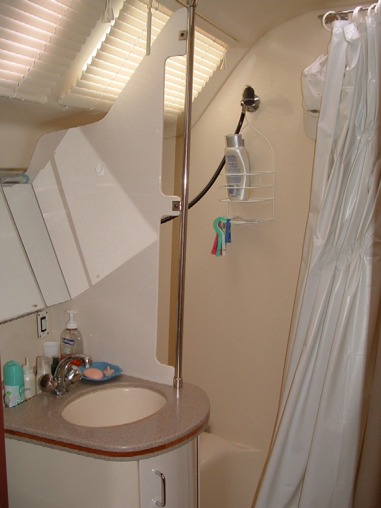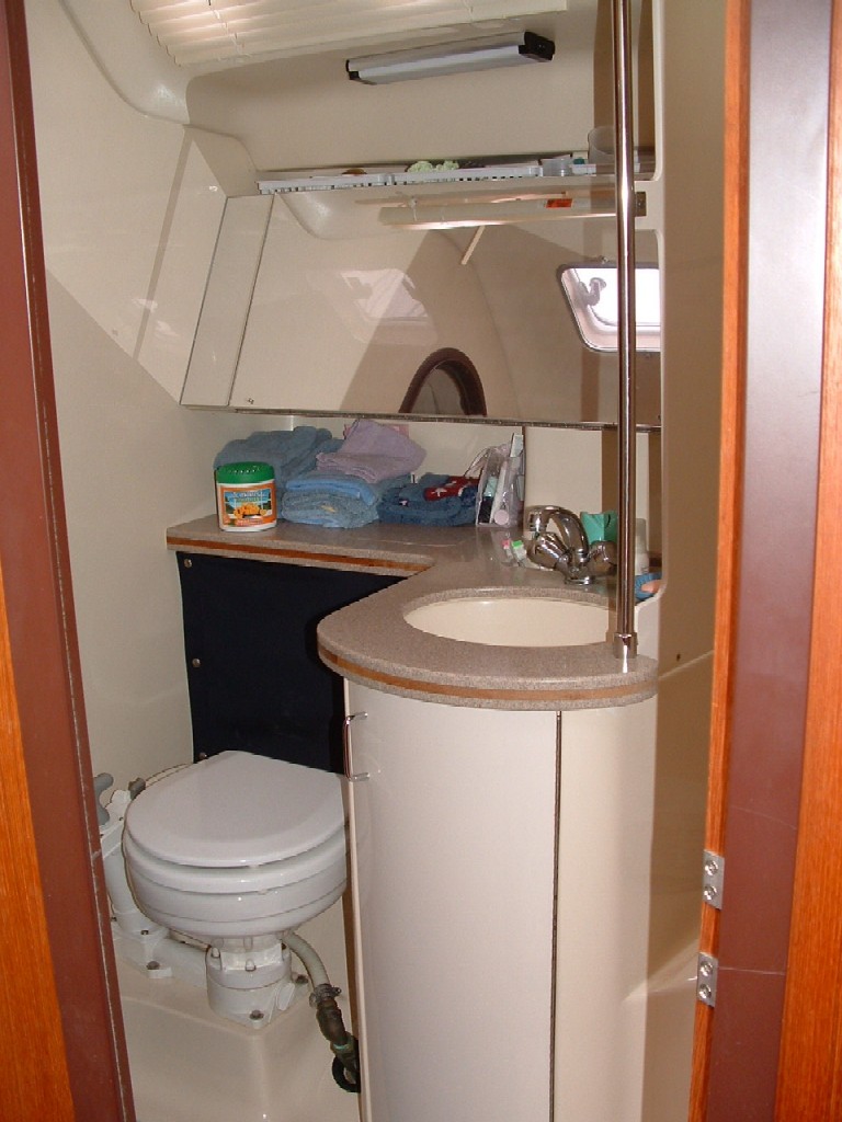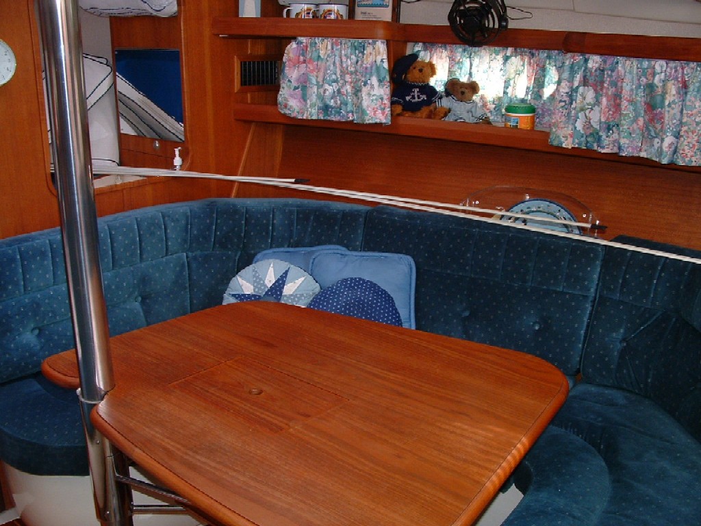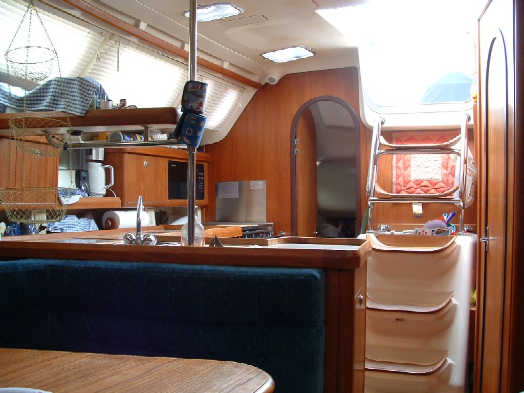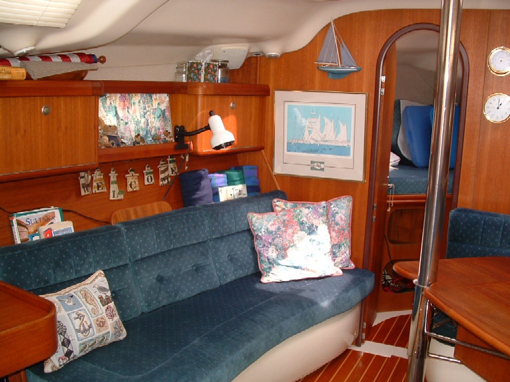 The 376 includes a roomy cockpit with hinged helm seat and walk-through transom to the swim platform. She has a bright interior thanks to her main cabin windshield, two private staterooms and a well equipped galley. Open and spacious with ample storage. Ours is a wonderful cruising yacht, a great combination of sailing performance and livability. We have kept her very well maintained.