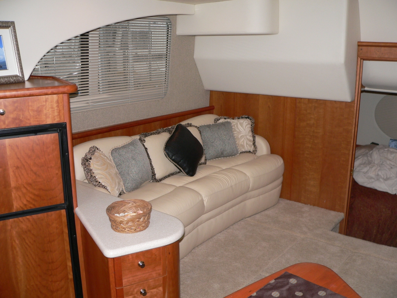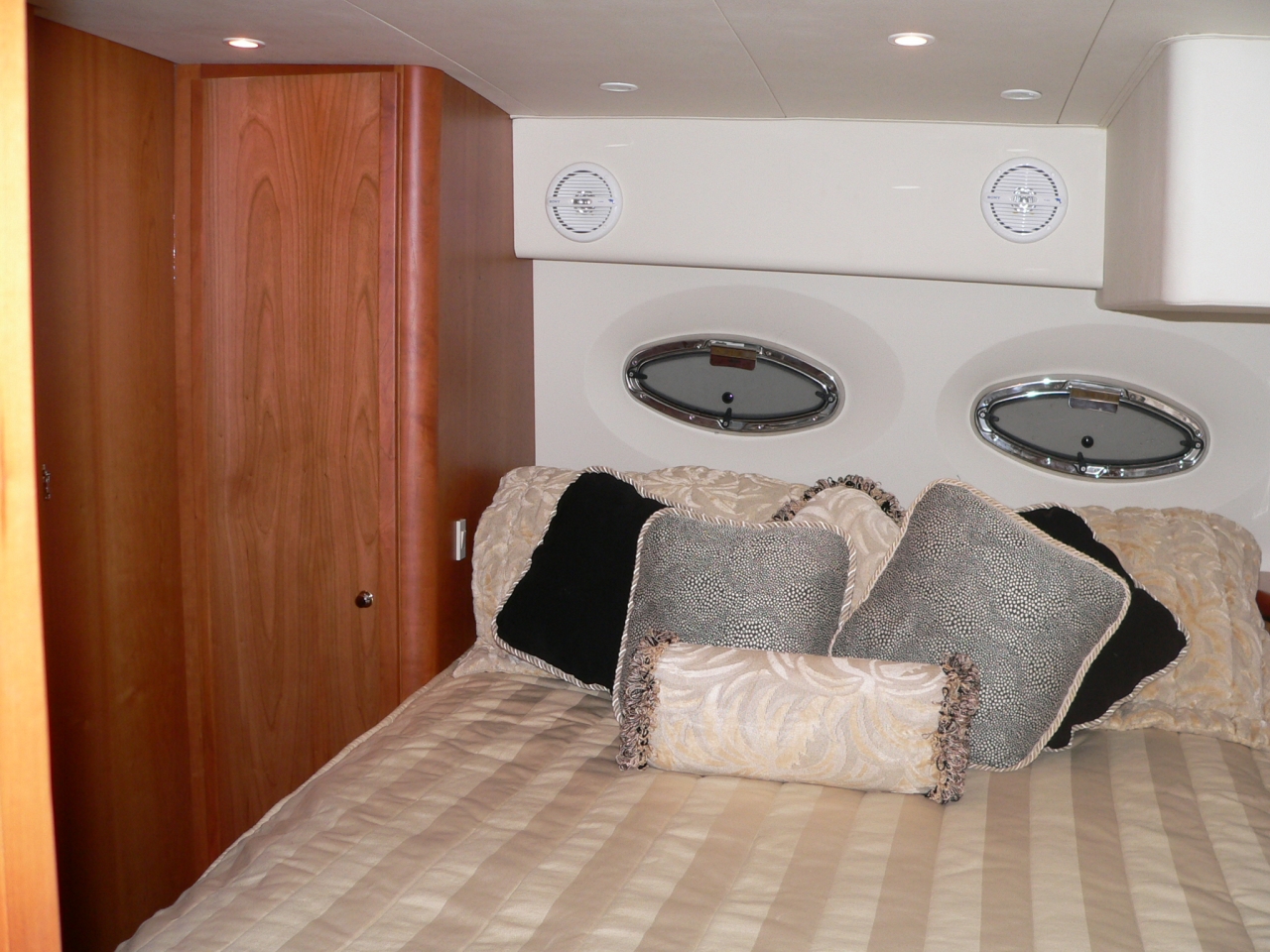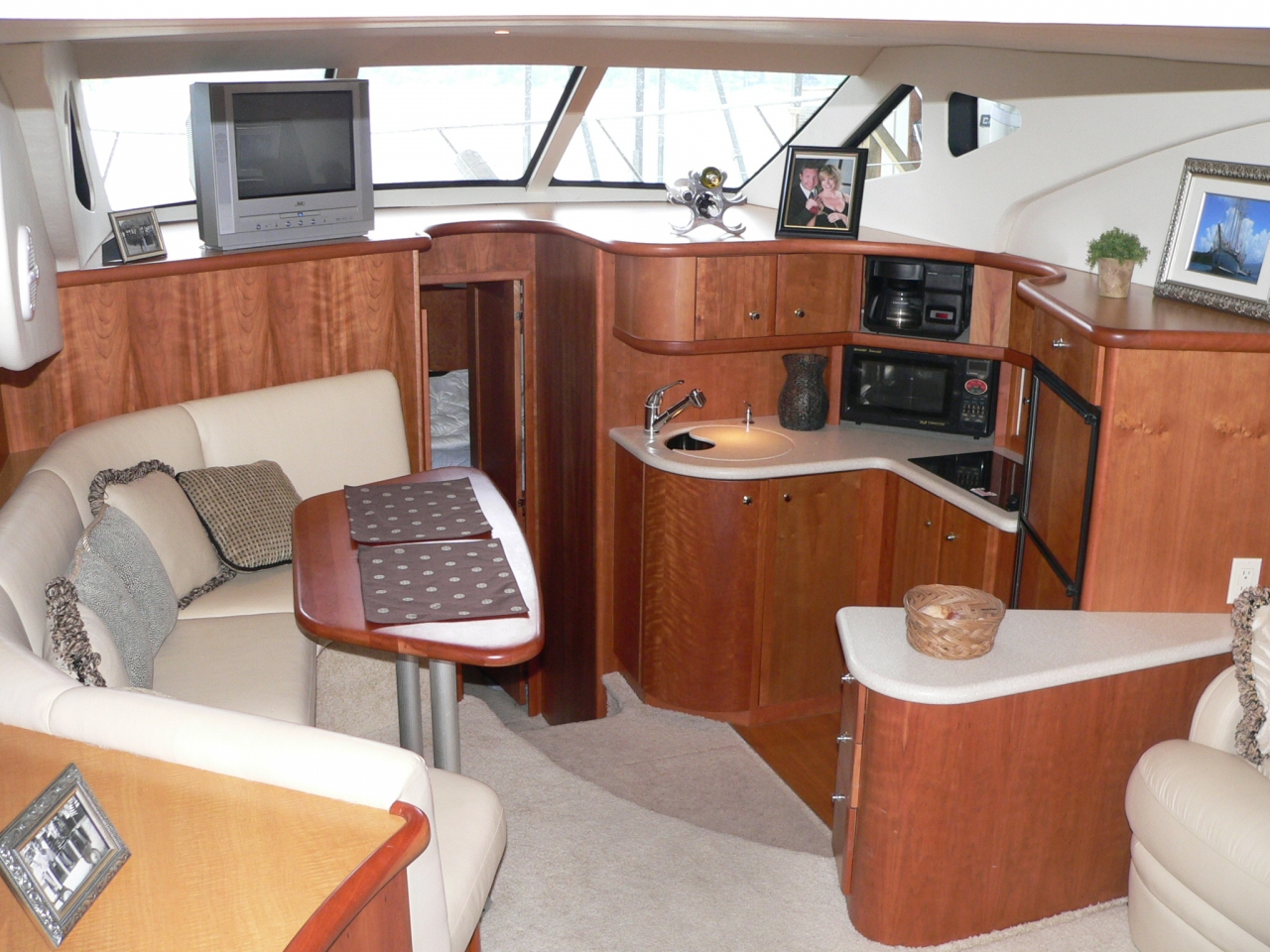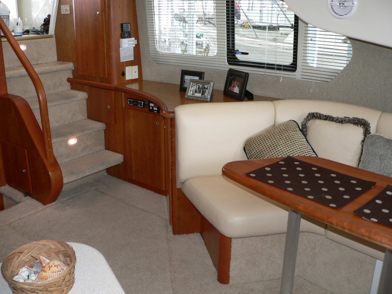 Guest stateroom forward, head with toilet, sink and vanity aft to port, stall shower to starboard. Aft and up two steps to galley starboard. U-shaped dinette opposite. Up one step to salon. Down and aft two steps to master stateroom. Ensuite head with large stall shower to port. Beautiful cherry interior is very warm. From salon up four steps to aft deck. Up three molded-in steps to spacious flybridge.