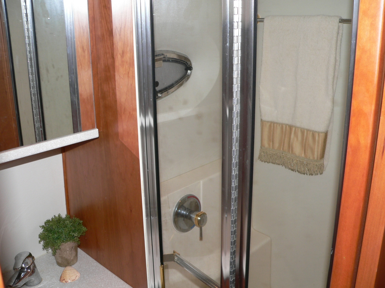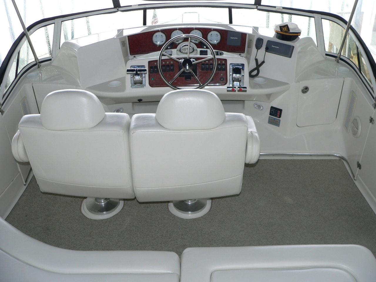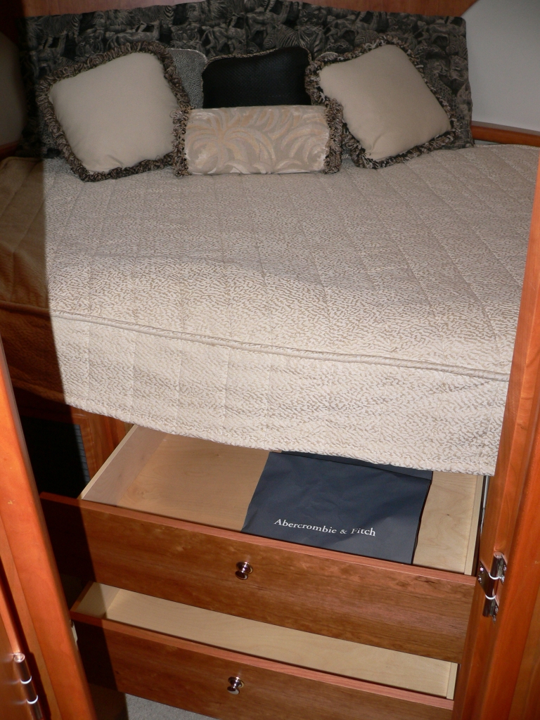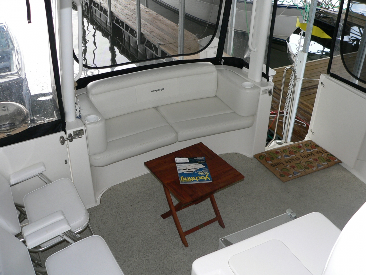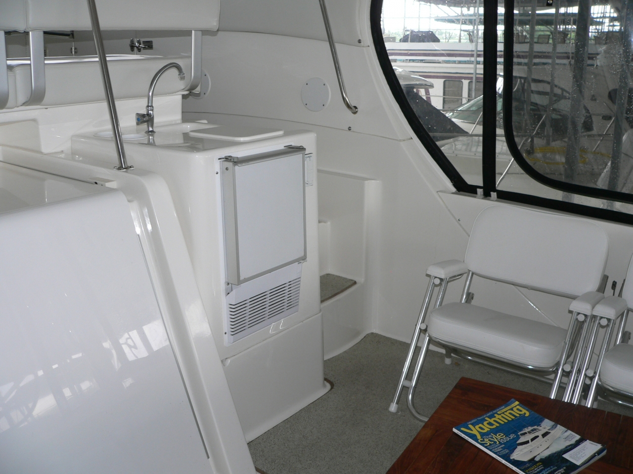 Guest stateroom forward, head with toilet, sink and vanity aft to port, stall shower to starboard. Aft and up two steps to galley starboard. U-shaped dinette opposite. Up one step to salon. Down and aft two steps to master stateroom. Ensuite head with large stall shower to port. Beautiful cherry interior is very warm. From salon up four steps to aft deck. Up three molded-in steps to spacious flybridge.