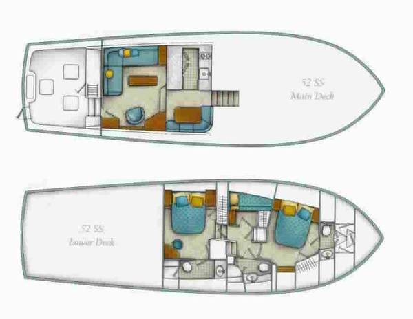 VIP stateroom feature an island queen berth, TV/VCR, stereo with CD player, extensive storage and private head with stall shower. A comfortable over/under bunk arrangement sleeps two in the carpeted crew stateroom with a 3rd head.