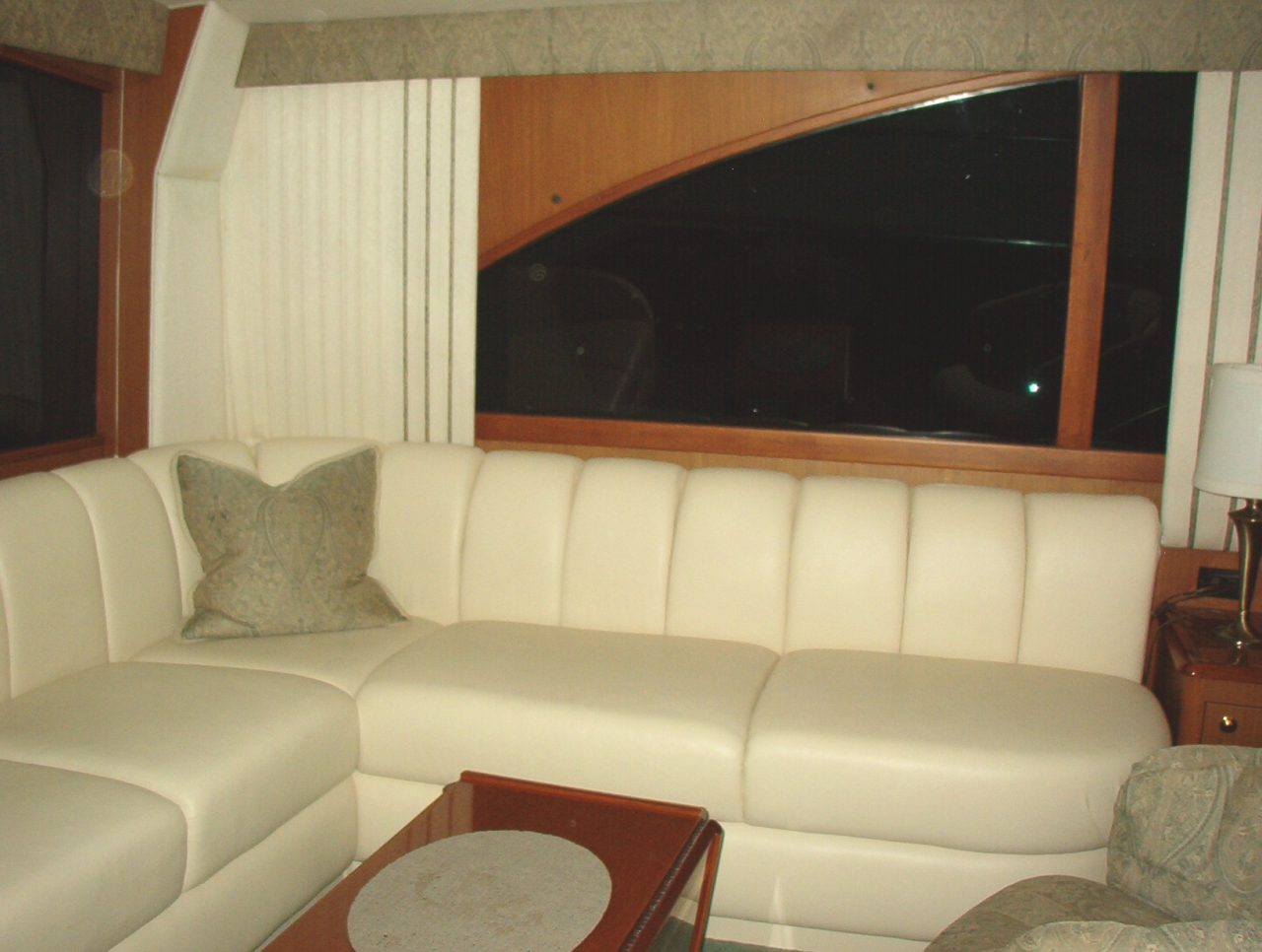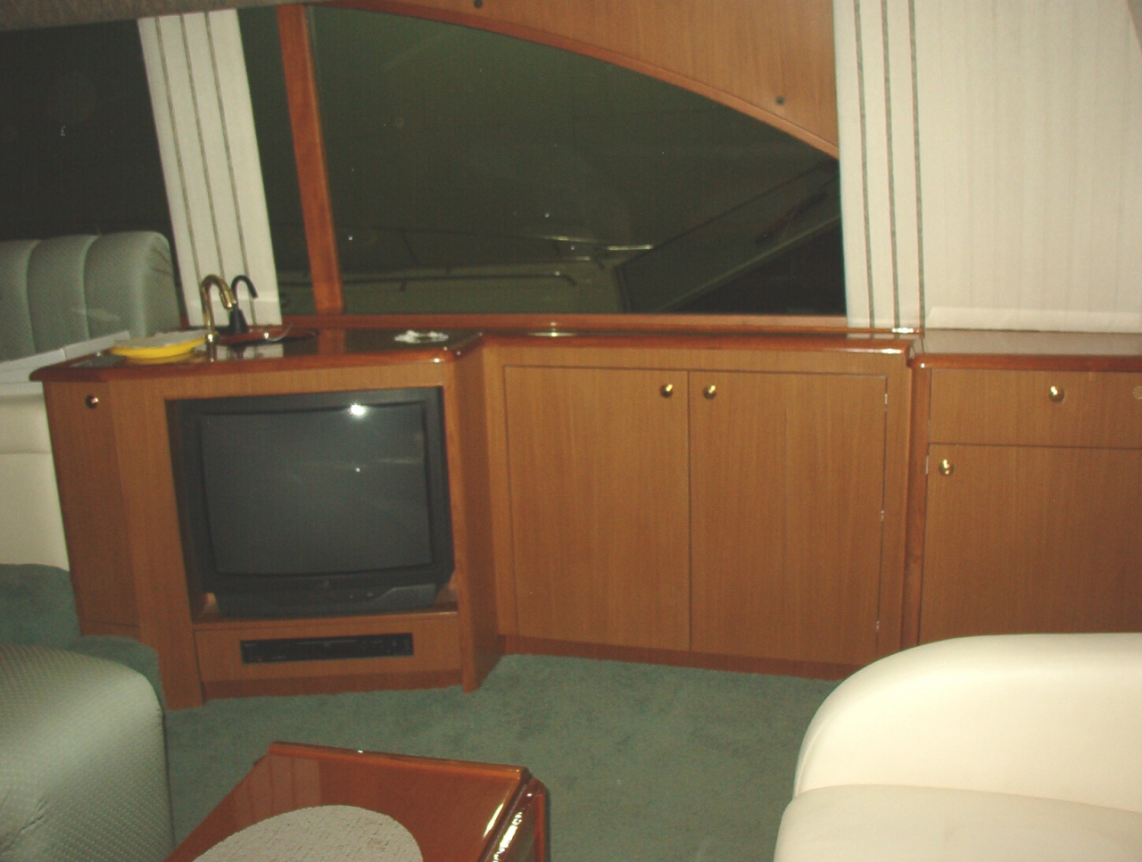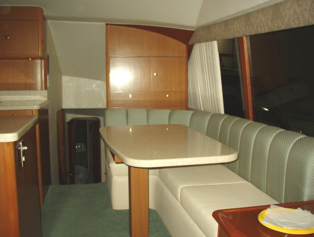 The salon is roomy and bright, tastefully upgraded to include Ultraleather L-settee, teak paneling and solid tambour cabinet doors. Duette blinds and a tinted aft salon window and door provide excellent privacy. A color TV with VCR and and Stereo with CD player are included in the entertainment center/wetbar.