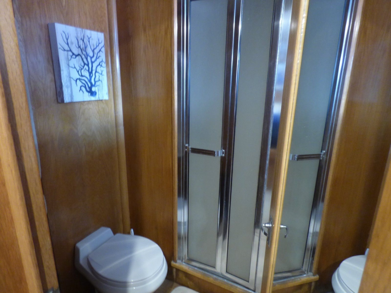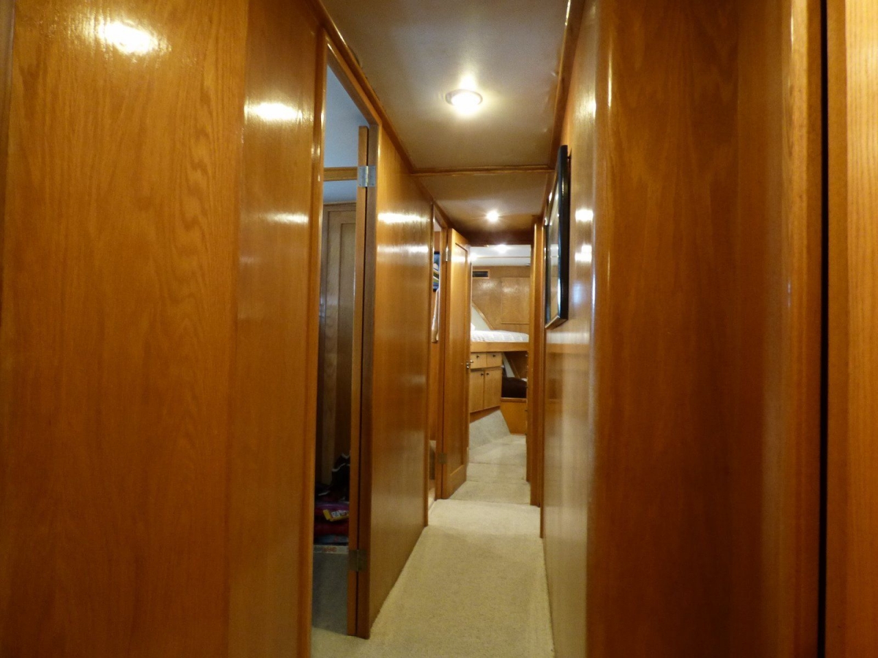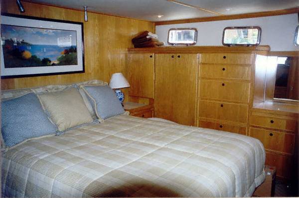 Walk-around queen berth, plenty of storage, hanging locker and an ensuite head with Jacuzzi tub/shower. The master is separated from the engine room by a companionway with three doors and main fuel tanks. The lower level is finished in a white oak.