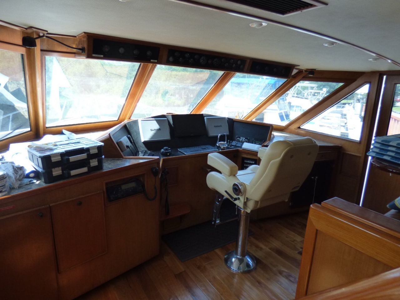 (3) GARMIN 7212 touch screen displays with AIS Receiver and Transmit (2014), (2) Elbex video monitor cameras, Wesmar LH-1500 hailer/intercom, 12V computer with Nobletek chart software, SEA 222 SSB radio. ACT electro - helm engine controls with 3 remotes. Stidd pilothouse chair.