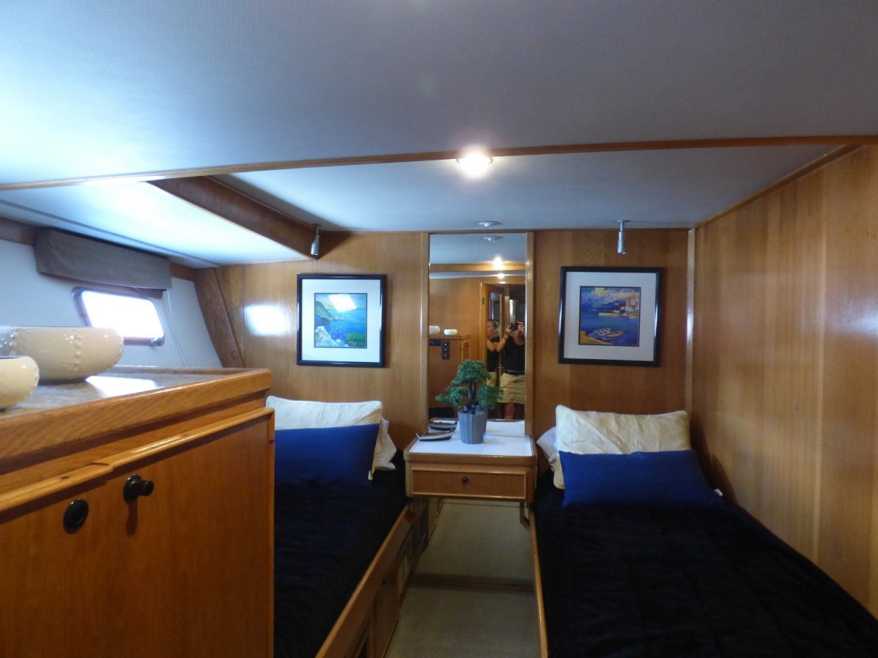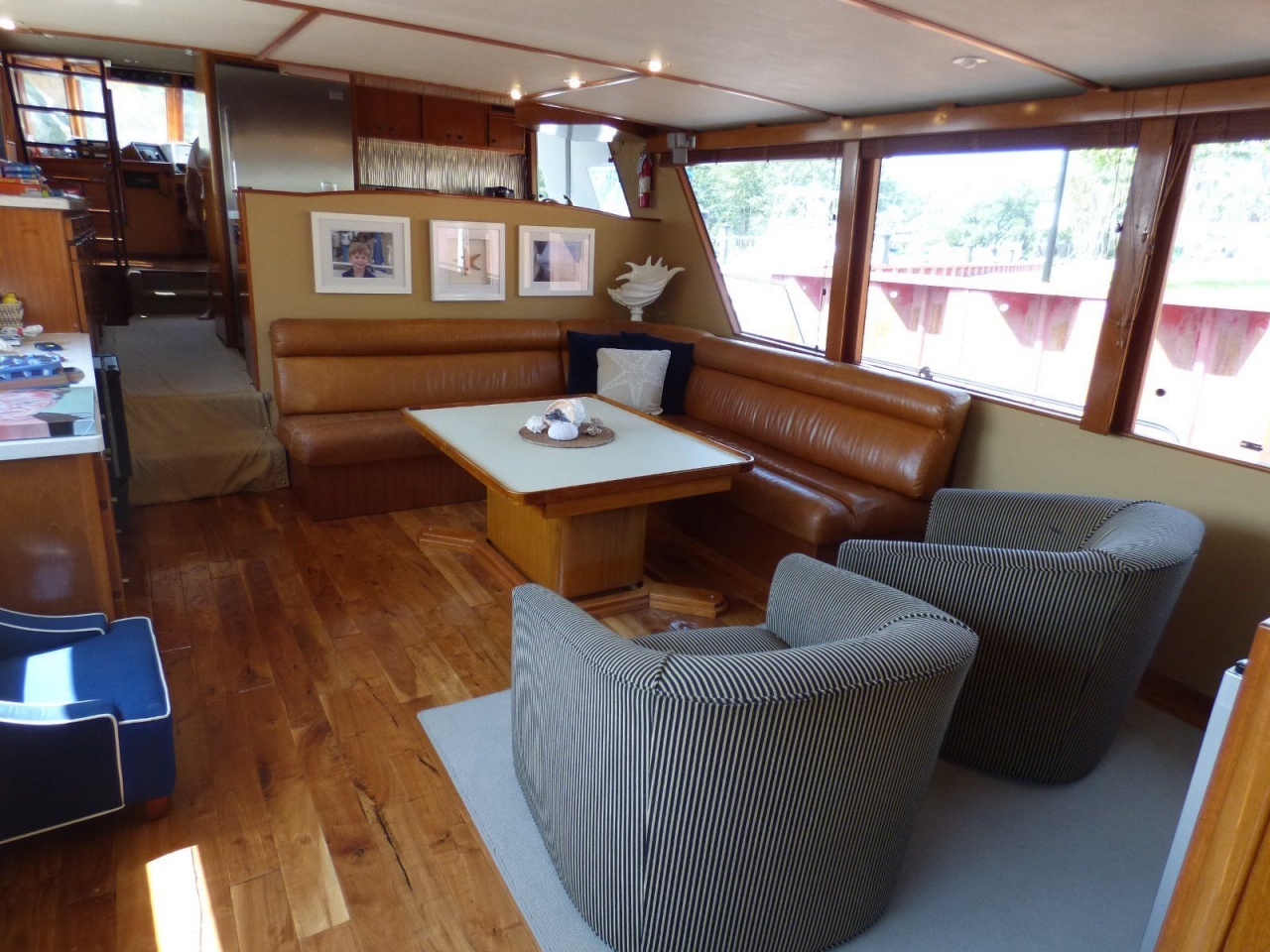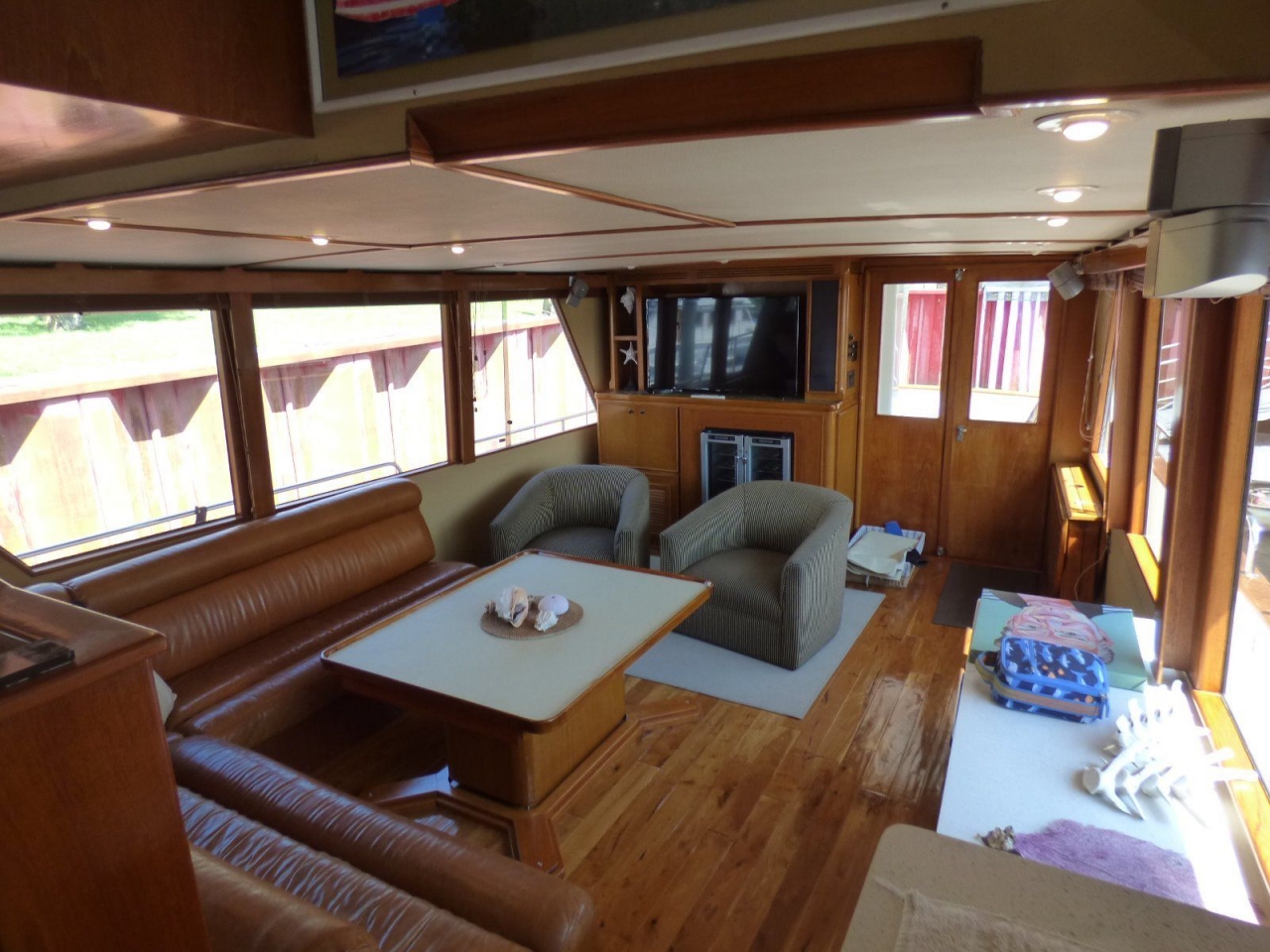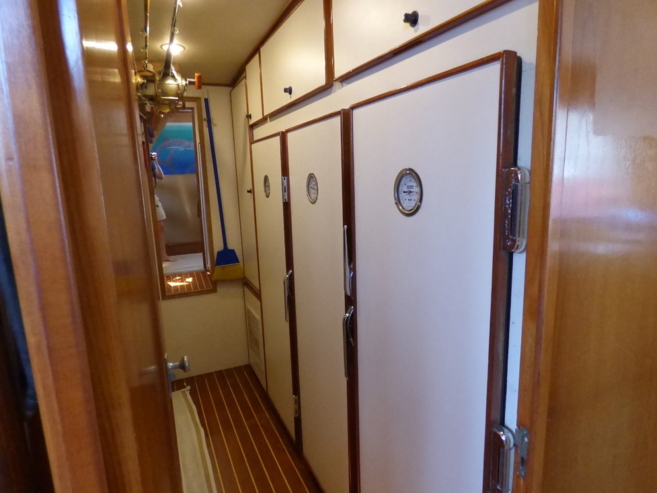 The pilothouse features complete instrumentation, side doors with screens, teak stairway to flybridge and custom raised settee with two concealed tray tables. Next aft and down two steps to starboard is the walk-in pantry room, storage lockers and three 15 cu. ft. vertical cold plate refrigerators/freezers. On the same level is the gourmet galley overlooking the salon. Opposite the galley is a teak cabinet with drawers and two shelf lockers. New quartz countertops.