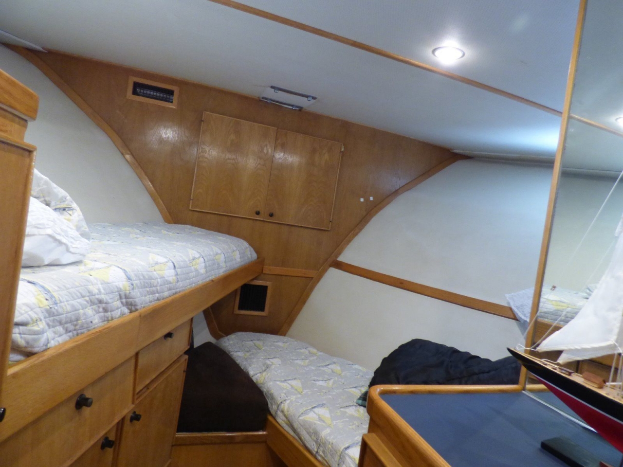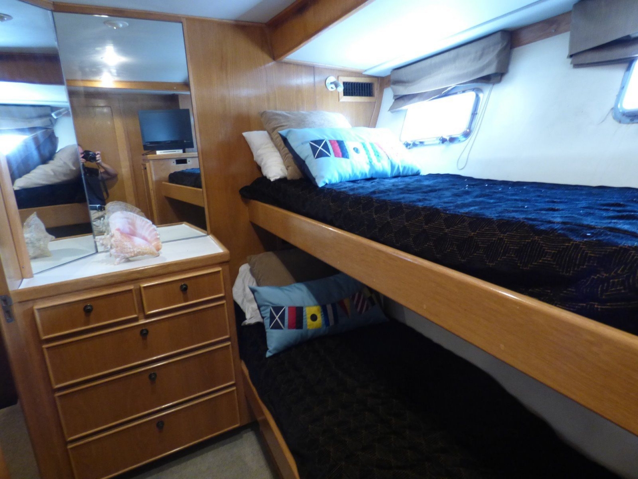 Four stateroom layout features a guest or crew stateroom forward with two large bunk berths, abundant storage and ladder to foredeck. Just aft to port is the second guest stateroom with over/under berths, hanging locker, five drawer dresser and ensuite head. The third guest stateroom to starboard features twin berths, hanging locker, abundant storage and direct access to head and shower with additional access from companion way. Next aft are the walk-in laundry room with full-sized washer & dryer, large four-door pantry and cleaning supply locker.