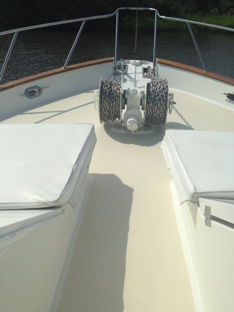 Bow & Sidedecks: Portuguese bridge with walk-thru gate, two bench seats forward with four hatches to storage areas below, clever hatch to forward stateroom, teak side decks, S/S railing with teak caprail, covered side decks with overhead lighting and Lexan wing doors, port & starboard boarding gates.