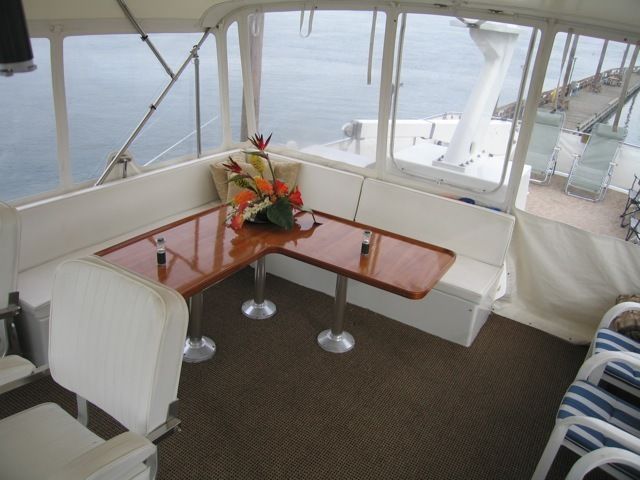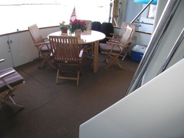 Flybridge: Access from cockpit or pilothouse, forward helm station with two helm seats, custom L-shaped settee with table, custom storage locker with built-in propane BBQ, two tenders, davit and aft helm docking station.