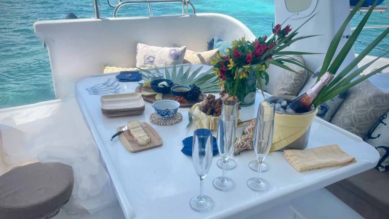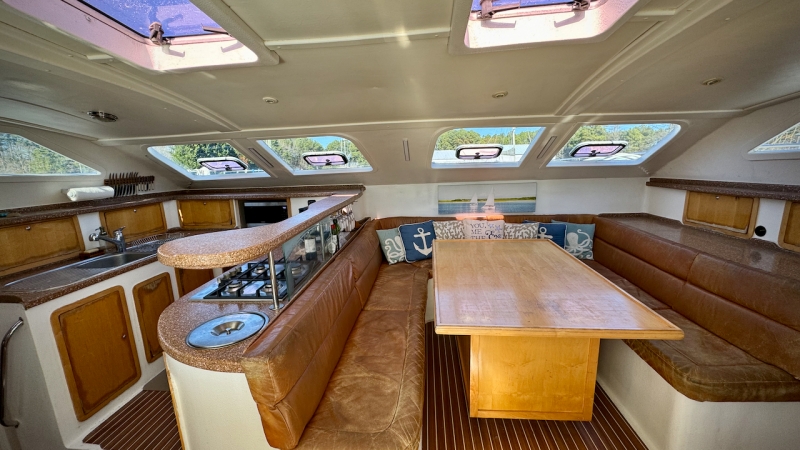 Leather u-shaped settee around main dining table, easily room for 8 people around table. Dining table top flips up for access to top-loading deep freezer underneath. Nav station with main electrical panel. Clear ice maker. Storage for games, rum locker, pantry items, etc. Sliding door and window open onto cockpit.