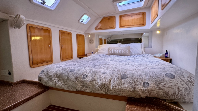 Three guest staterooms with queen sized mattresses, one guest stateroom with V-berth, all custom mattresses new 2017. All staterooms have ensuite heads/showers. All staterooms and heads have opening hatches/portholes and fans for excellent ventilation. All heads have freshwater Techma electric macerating, 2-stage water-saving heads with backup emergency saltwater plumbing. Ample hot water supplied by two 21-gallon Quick stainless steel hot water heaters. “Whole house” water filters port and starboard. All staterooms have speakers, 110v outlets and 12v “cigarette-style” outlets. All staterooms have one hanging locker and multiple stowage lockers. Two aft staterooms have additional single bunk under queen-sized bunk.