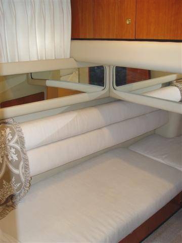 3rd Stateroom - bunk, mirror, seating, drawers, cabinet storage, circular skylight.