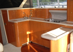 Port forward is Corian dinette table and galley counter tops. Large, bright galley up to starboard.