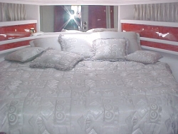 VIP Stateroom - full-size bed w/innerspring mattress & drawer storage. Hanging locker, cedar-lined w/light & mirror door. Mirrors, circular skylight. Storage, drawers. TV/VCR/Radio combo.