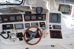 Large cockpit with glass sliders to salon and molded stairs to bridge. TNT lift at swim platform.