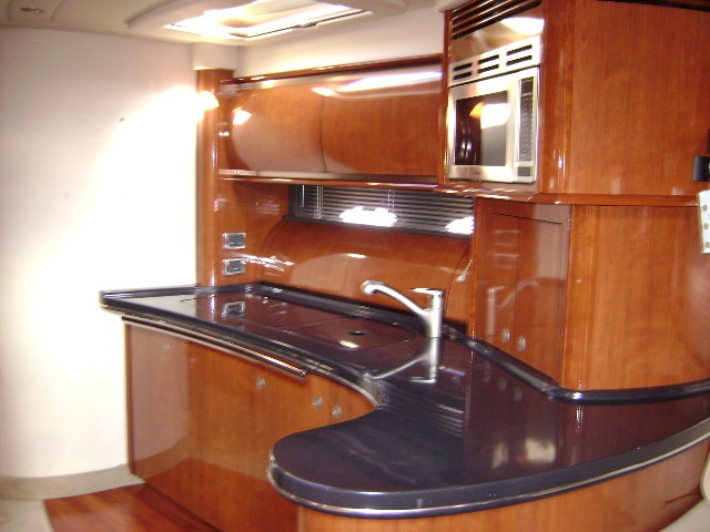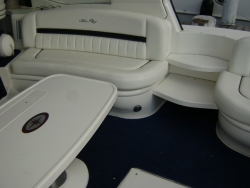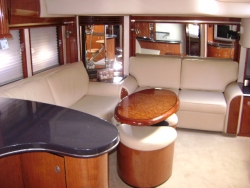 Cockpit has wrap around lounge seating across from the stern and up the starboard side. Fiberglass high-low cockpit table. Full wet bar with sink, refrigerator, ice maker and ample storage. Forward Helm area is starboard with pedestal helm chair. Companion helm seat rotates to form a port lounge settee for relaxing and entertaining.