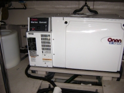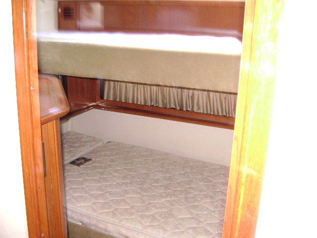 All the way forward, the master stateroom has an island queen size bed centerline with innerspring mattress with coordinated bedspread, pillows, and sheets; drawers and carpeted storage below. Starboard hanging locker is cedar-lined with mirrored door and light. Port hanging locker is full-length with lights and mirrored door. 15" Flatscreen LCD TV (120V)/DVD combo with coax outlet. Vanity with solid surface countertop.